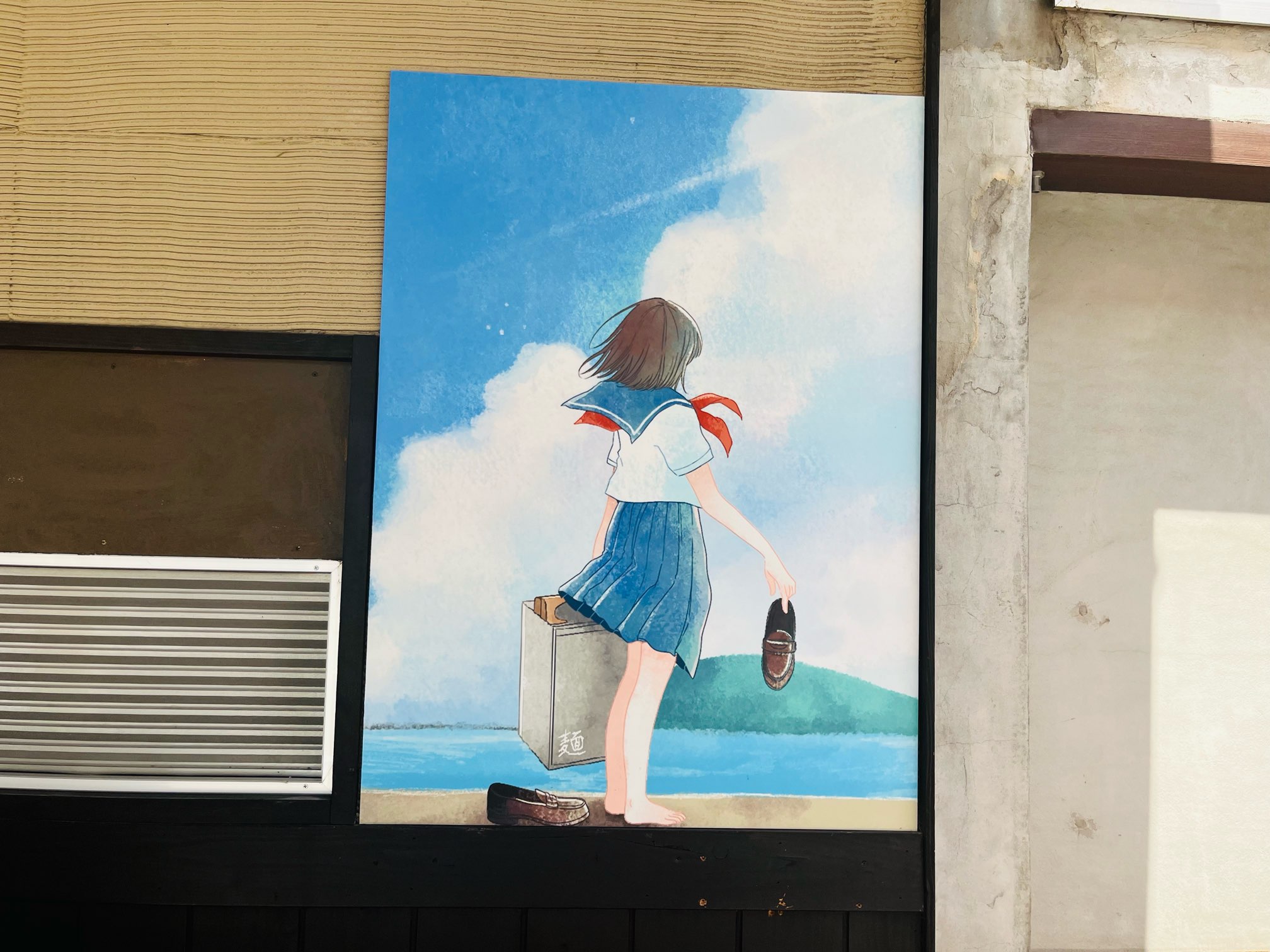 青空のもと浜辺に立っているセーラー服を着た女の子が麺と書かれた岡持ちを持っている看板は、否が応でも目を引くし、これまで二郎のお店の看板と言えば濃淡がはっきりしたものが多かったですが、まるで夕焼けのようなグラデーションが施されていてめちゃくちゃ斬新です!