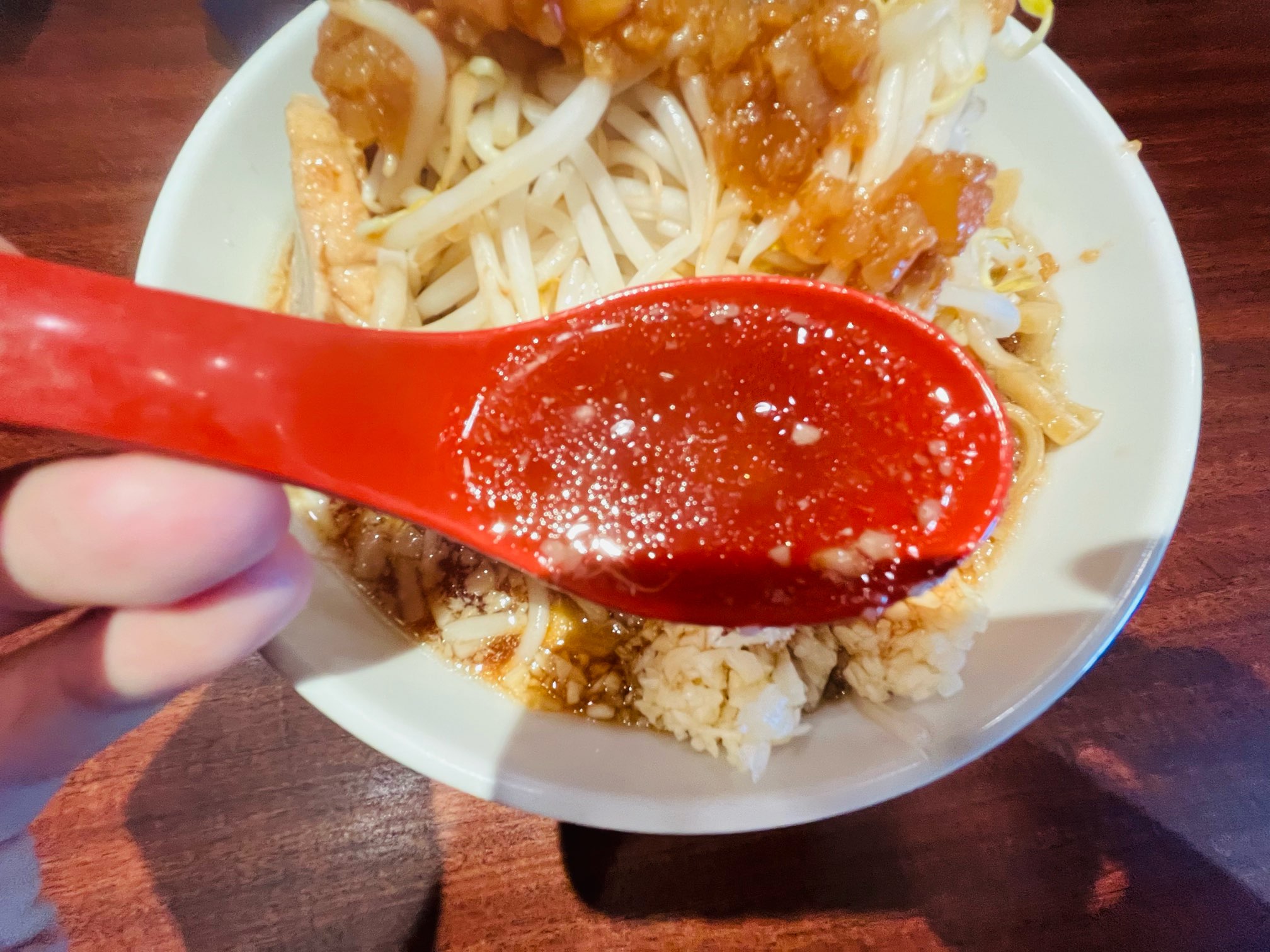 この時点では無料トッピングのアブラはあまり溶け出していない状態ですが、レンゲに泡のように漂うアブラは二郎の結晶のようなもの。ひと口飲んでみると豚の風味、旨味は土台としてあり、その上にある醤油が強いイメージ。