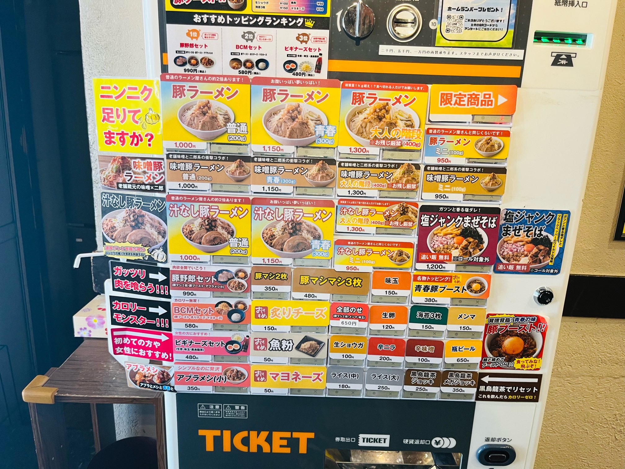 これだけ選択肢があると券売機の前で少し悩んでしまいます…。ですが、今回でこの連載も最終回!これまで数々の道場破りをしてきた身として、一切の躊躇なく豚ラーメンの青春をプッシュ。個人的には今でも青春気分で過ごしていますが、郷に入っては郷に従え。いわゆる青春時代のことを思い出しながら、青春系二郎ラーメンを啜り尽くしてやろうじゃないか。