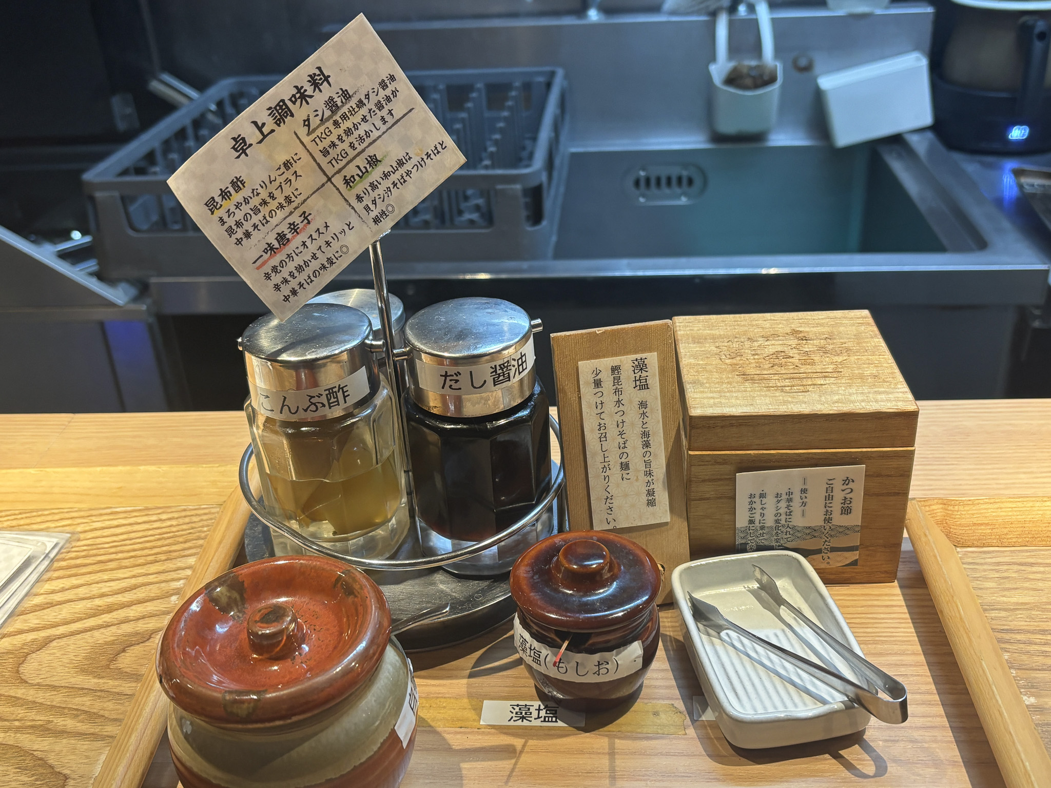 席には、藻塩や昆布酢、だし醤油など、出汁を引き立てる調味料が揃っています。