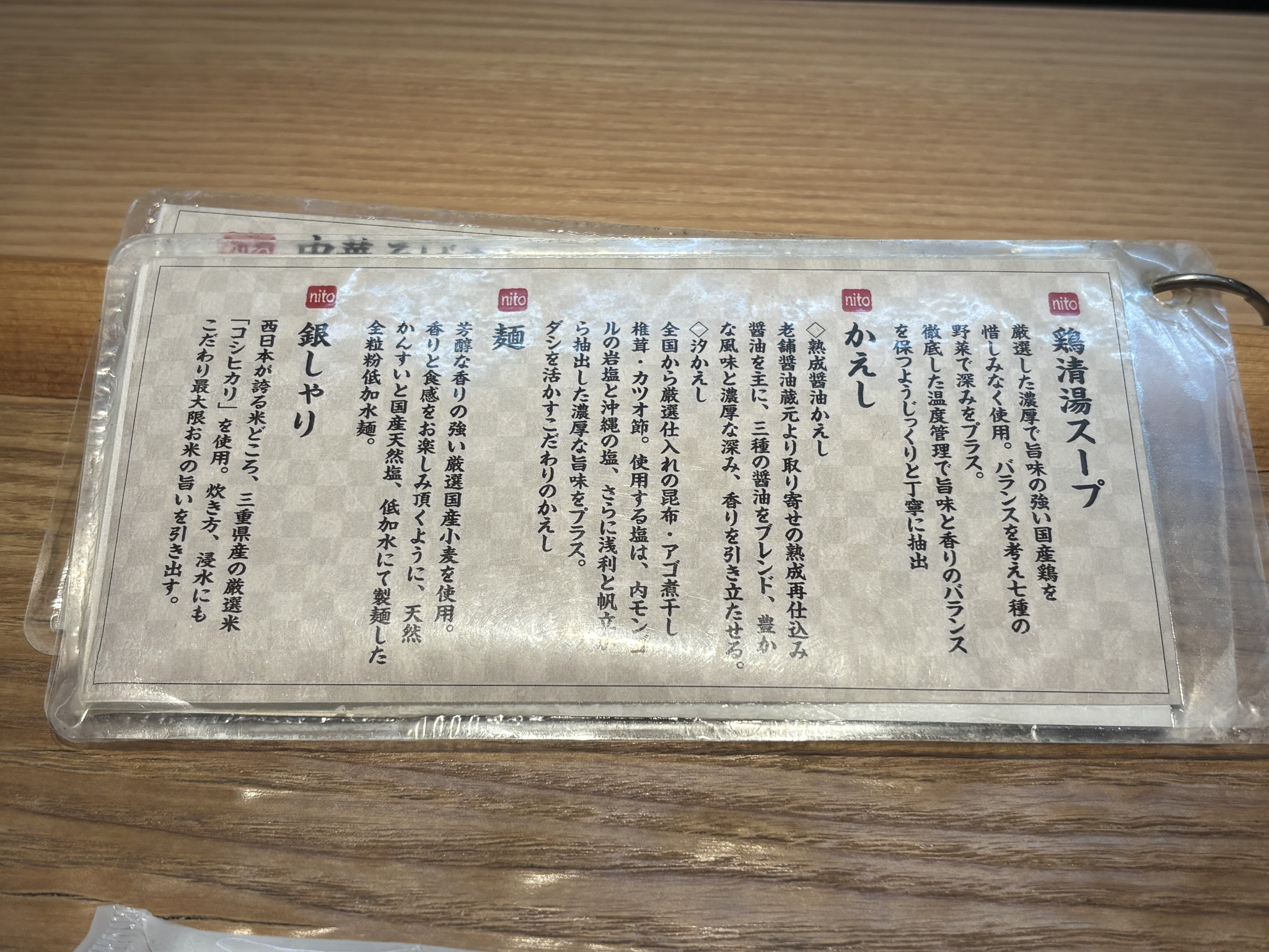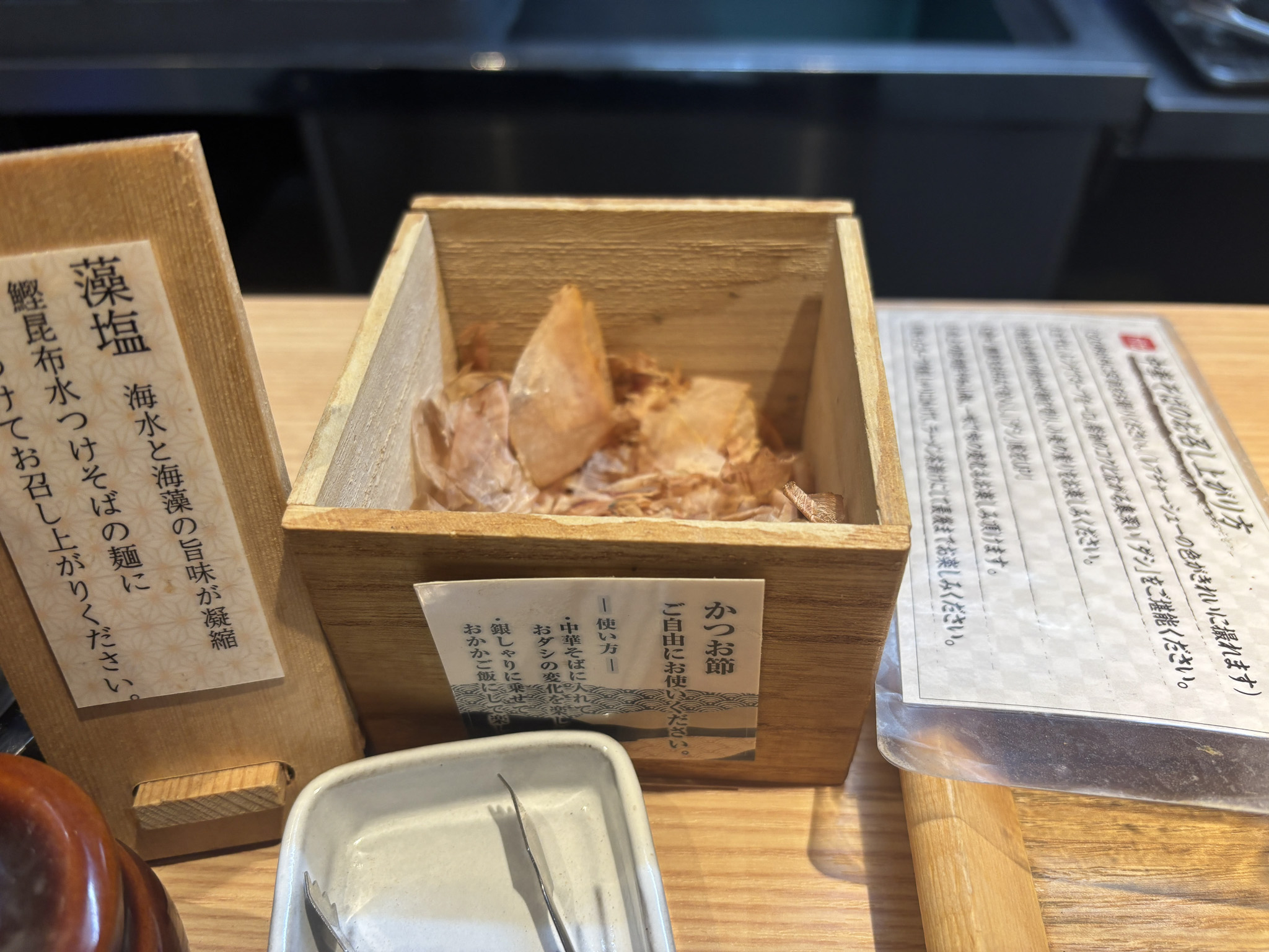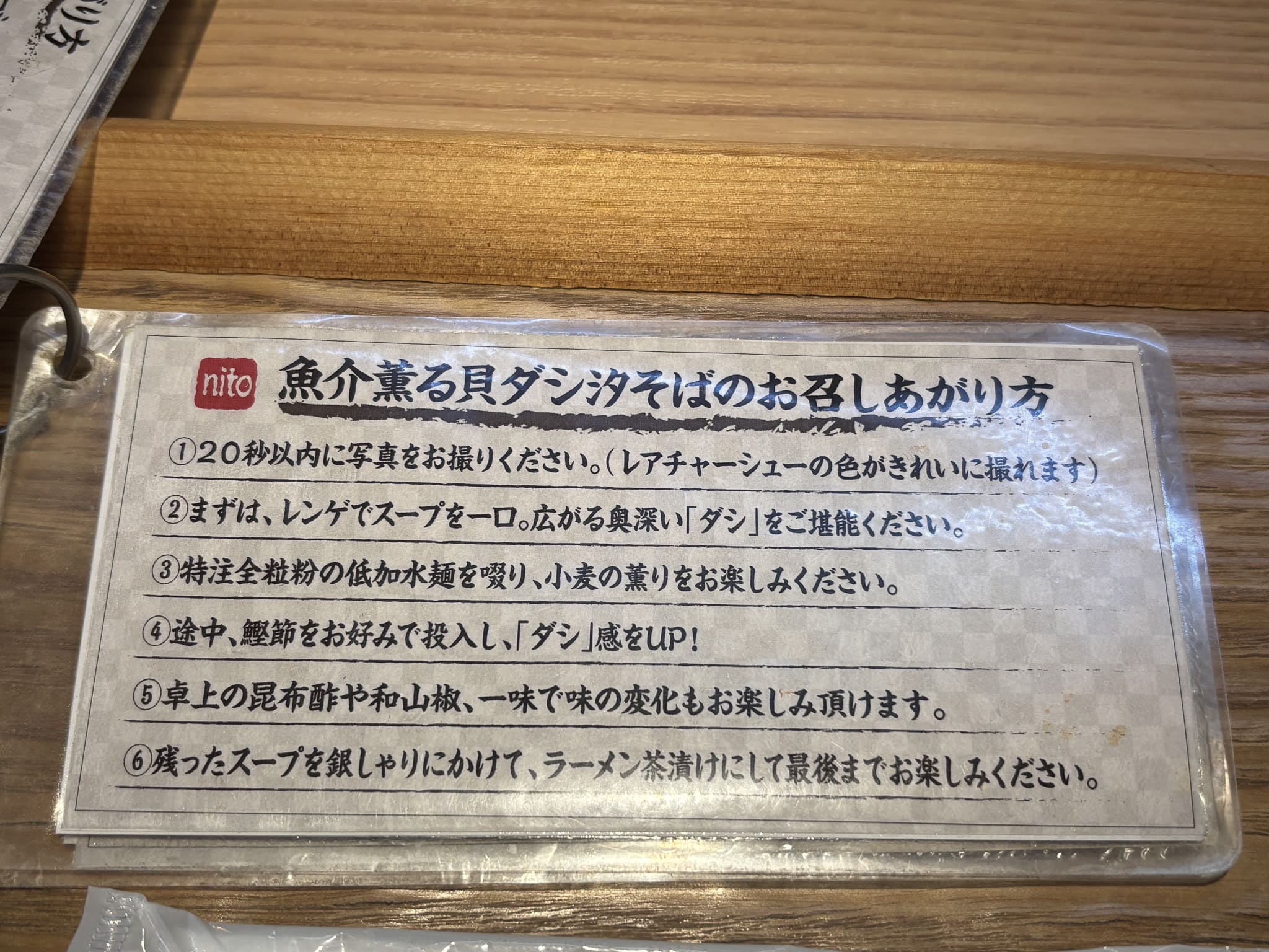 店内のカウンターには、出汁や素材へのこだわりが丁寧に書かれています。待っている時間も、これから味わう一杯への期待が自然と高まります。