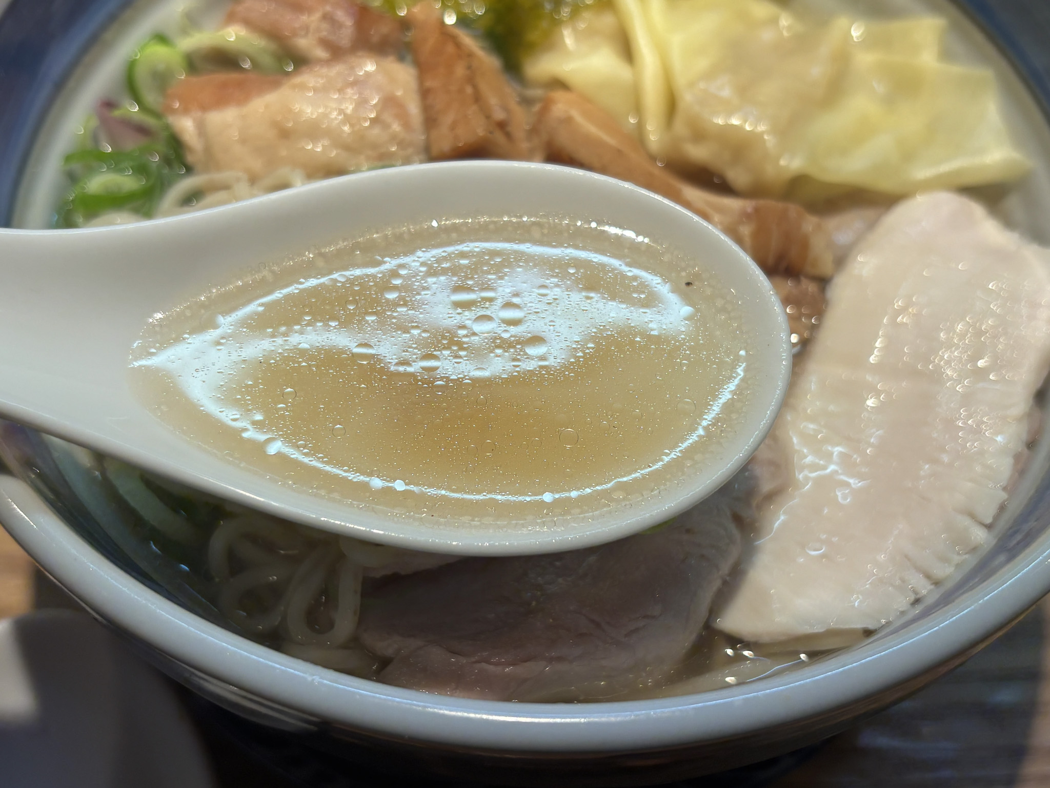 アゴの煮干しと利尻昆布でとったベースのダシに、ホタテとアサリの煮出し汁を合わせ、天然塩と沖縄塩で味を整えた一杯だそうです。