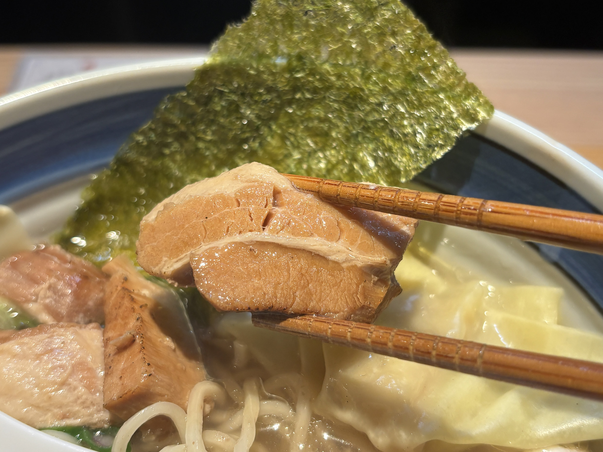 また、レアチャーシューは、目の前で軽く炙ってから提供。ほどよく脂がのっていて、香ばしさもありつつ、さっぱりとした汐スープと相性抜群です。
