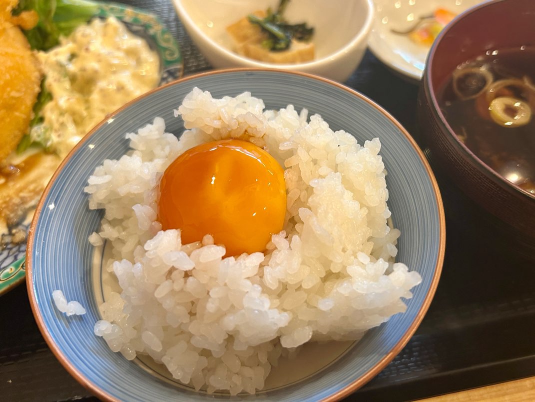 セットにはさらに、ご飯と相性抜群の漬け卵、彩り豊かな自家製浅漬け、そしてご飯と赤だしの味噌汁が付きます。