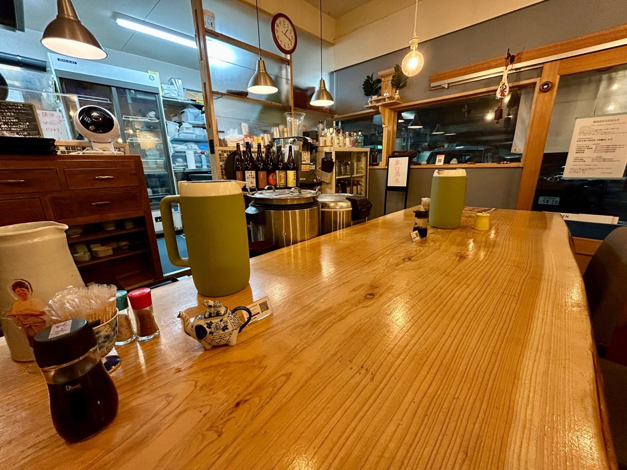 店内は、一枚板のカウンターを中心に、落ち着いた空間。