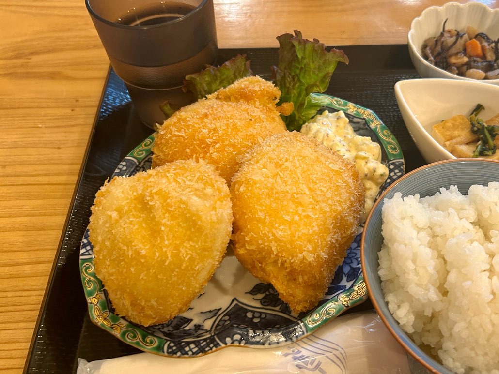 注文を受けてから揚げるこだわりのフライと、丁寧に作られたおばんざいがセットになった、大満足の定食です。