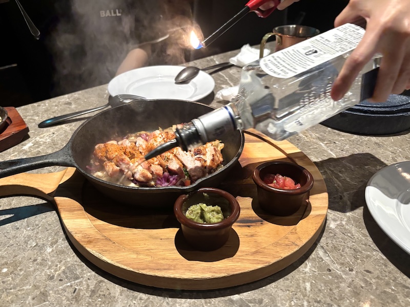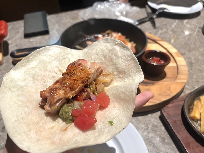 スパイスの効いたチキン、シャキシャキ感が心地よい野菜、もちっとしたトルティーヤが愉快な食感を演出しています。