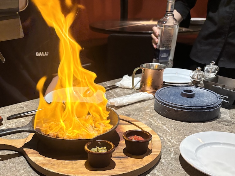 ぼおっと燃え上がった炎は、顔の高さまで迫るほど!座っている私にもその熱が伝わってきます。