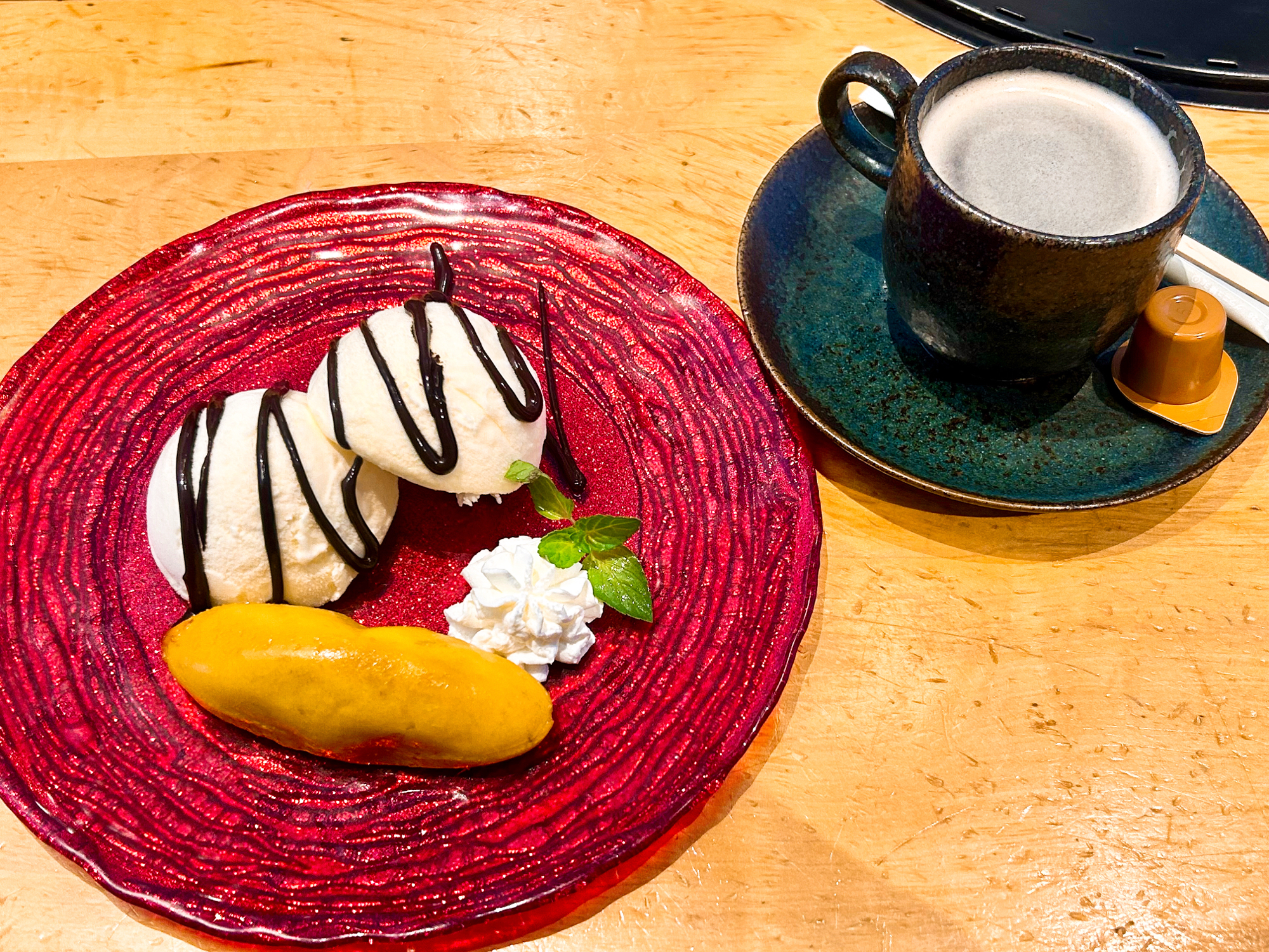 バニラクリーム2個にたっぷりとチョコレートソースがかかっていてとても贅沢…♡