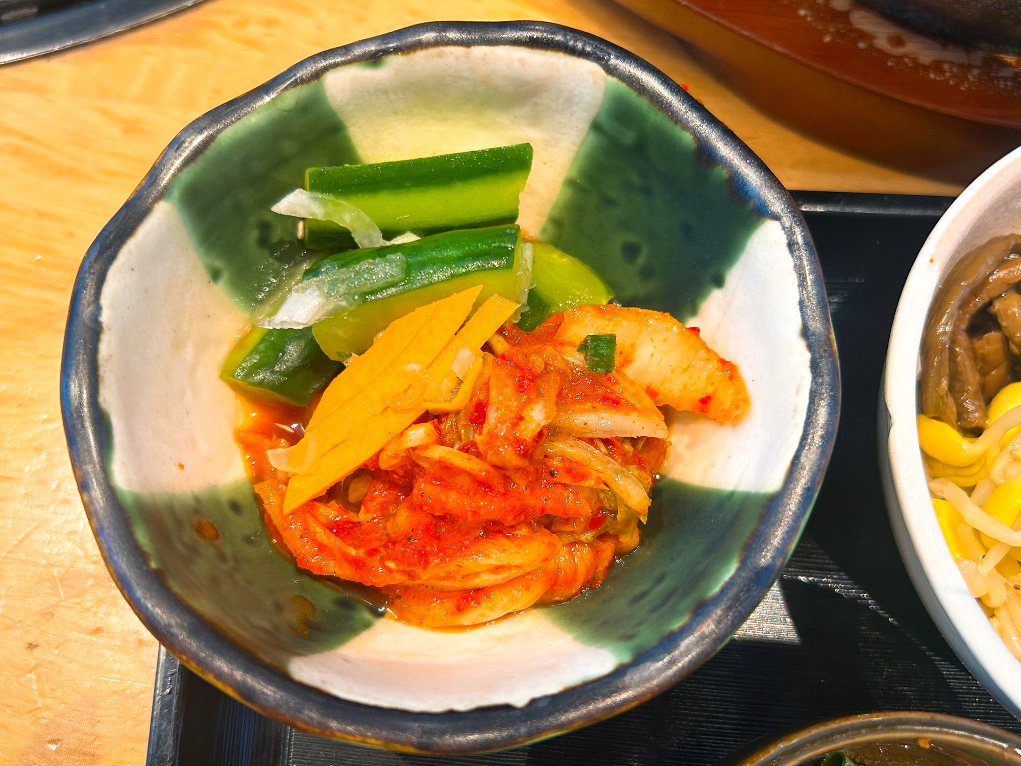 白菜とキュウリのキムチ。鮮やかな見た目!筆者はそこまで辛い食べ物が得意ではありませんでしたが、こちらのキムチは美味しくいただけました!