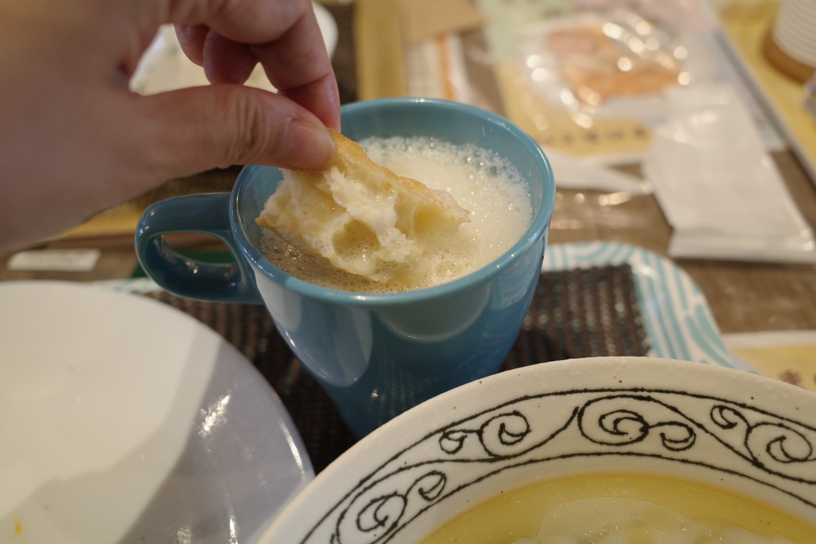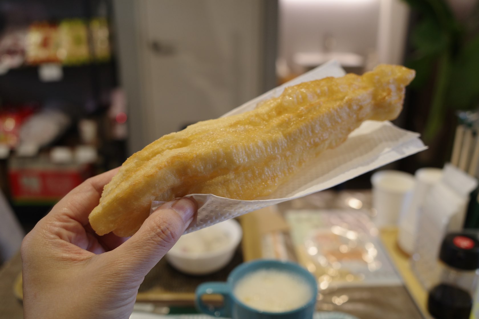 カリッと揚がったユーテオは、豆乳につけても良し、スープに浸しても良し。油っこさは不思議と感じず、むしろ素朴で、どこか安心する味わいです。