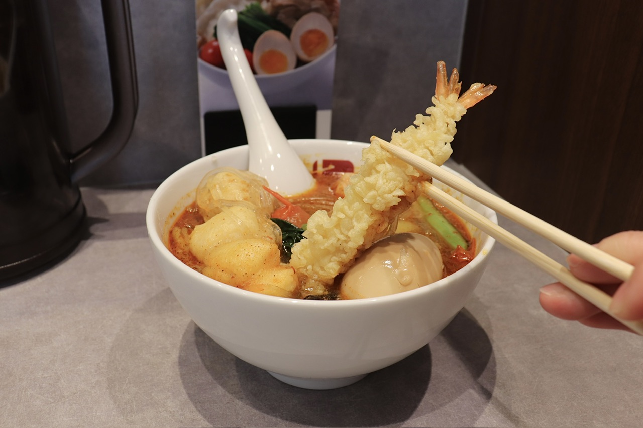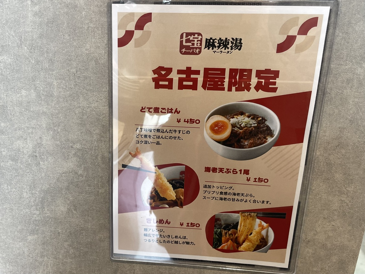 なんと名古屋限定のメニューもありました!八丁味噌使用のどて煮ご飯、海老天ぷら、きしめんなど、麻辣湯と名古屋メシの異色のコラボを楽しめます。