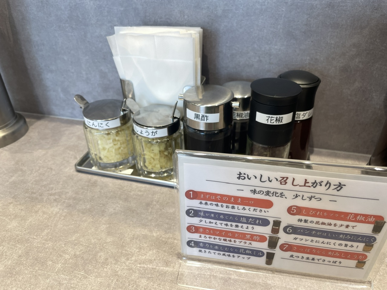 お会計を終えてカウンター席に着くと、卓上に味変用調味料が用意されていました。花椒や黒酢など定番が一通りあります。