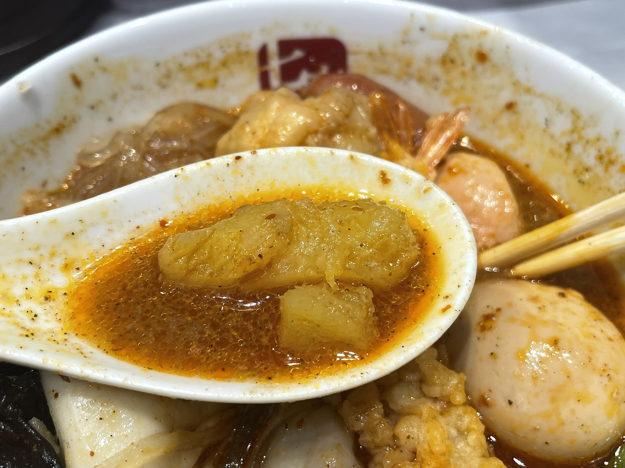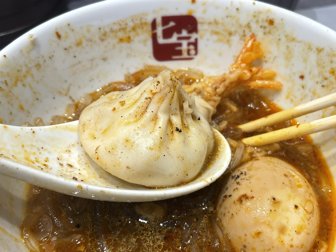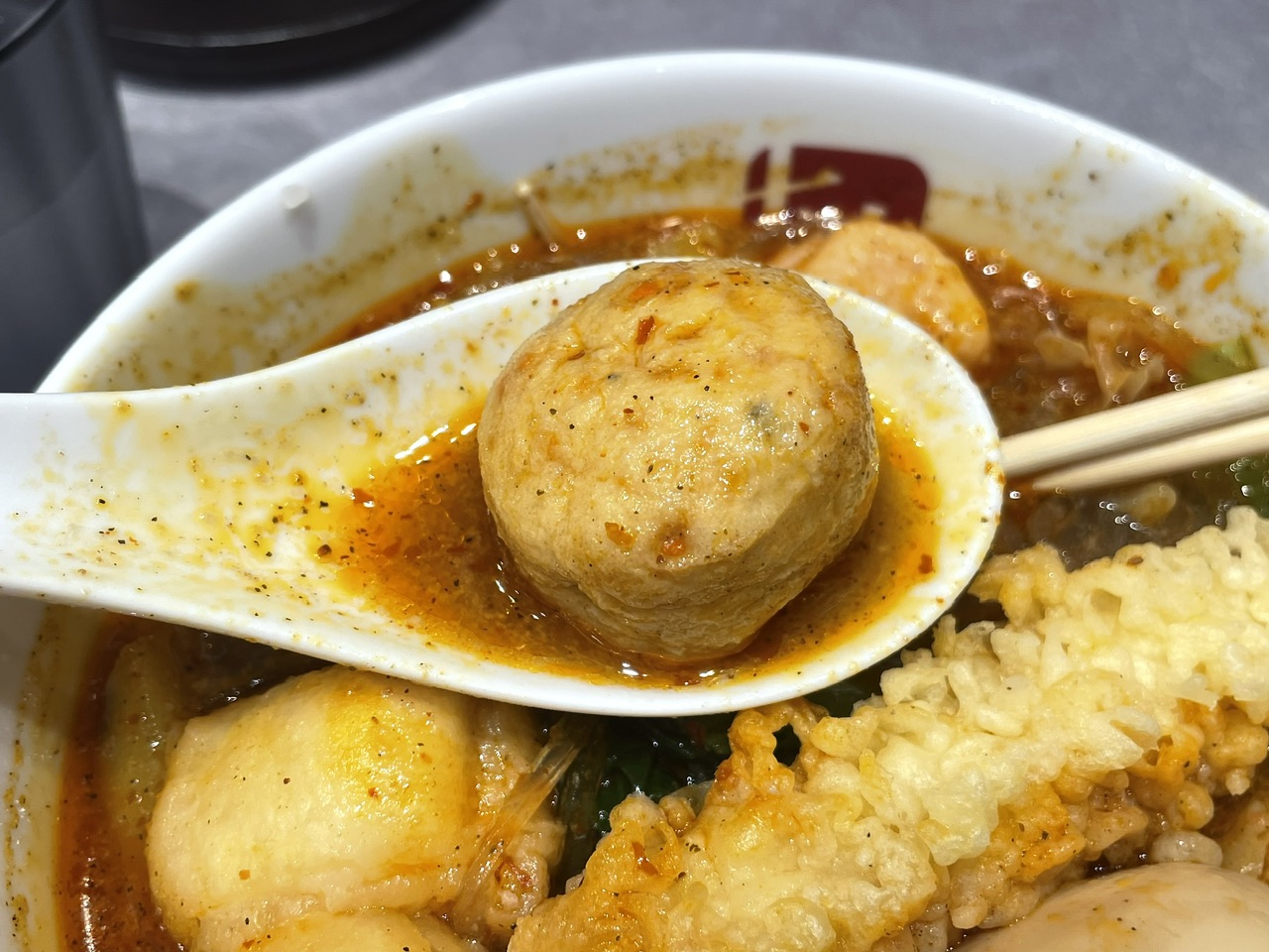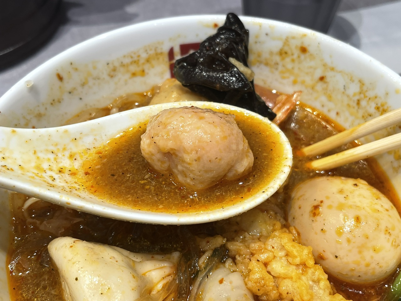 海老天は食べているうちにスープを吸いふわふわトロトロになっていきます。海老の身と天ぷらはまったく違和感なく麻辣スープに馴染み、想像以上に相性が良いと思いました。