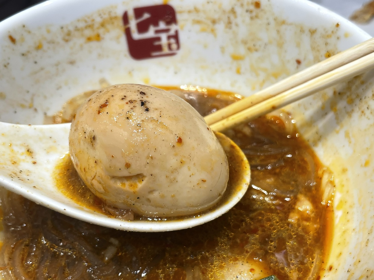 今回、SNSキャンペーンでいただいた味玉。濃厚な黄身と甘めの味付けが、辛い麻辣スープの中でホッとする一品となっていました。こちらもオススメです!