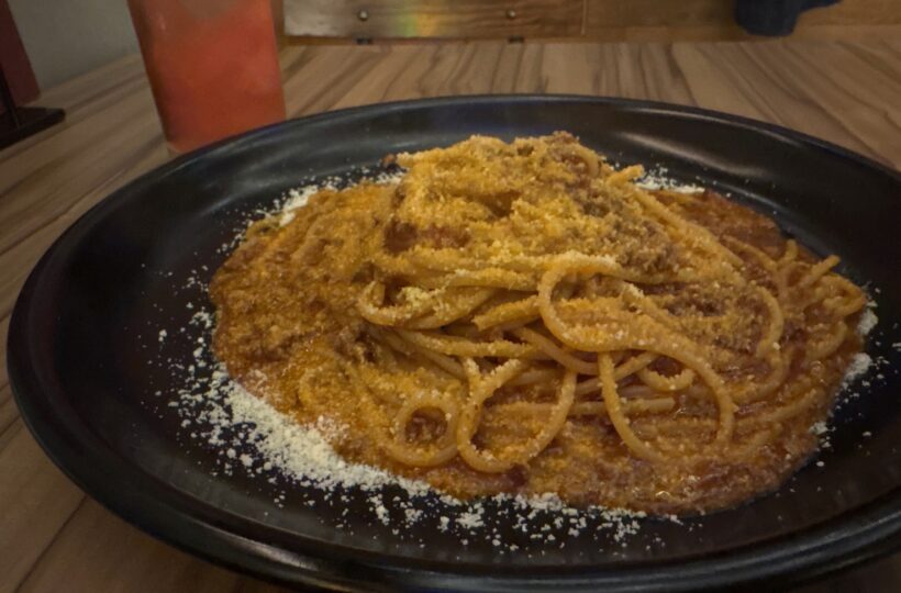 ボロネーゼが運ばれてくると、良い香りが漂いました。たっぷりのミートソースとチーズが美しく、写真映えも抜群の一皿です。