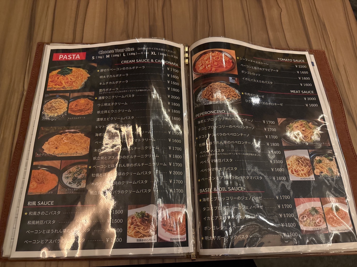 軽めのおつまみから、しっかりお腹を満たすメインディッシュまで勢揃いしています。画像の見開き1ページ、なんとすべてがパスタメニュー。スイーツも充実しており、どんなシーンでも重宝しそうです。