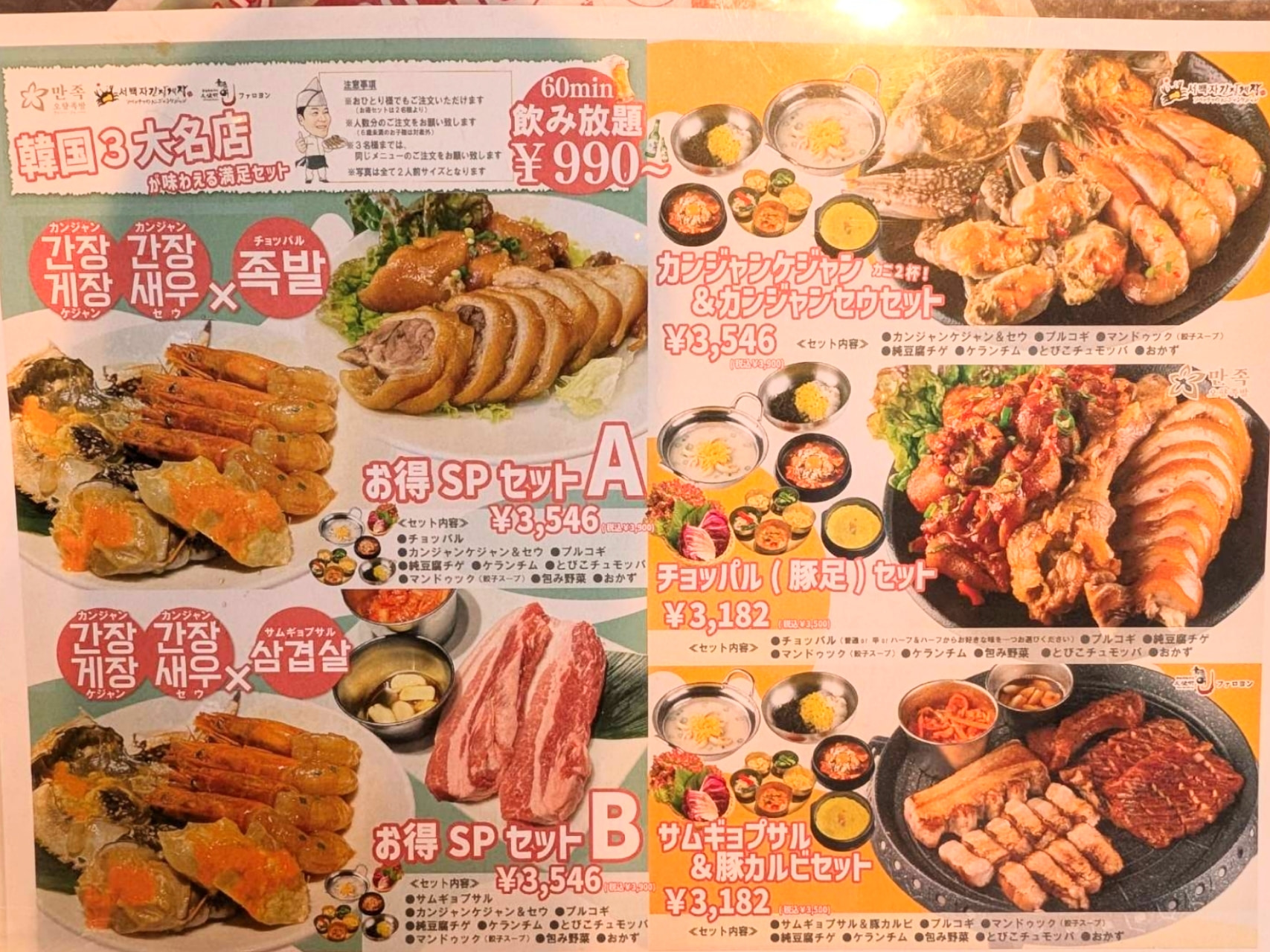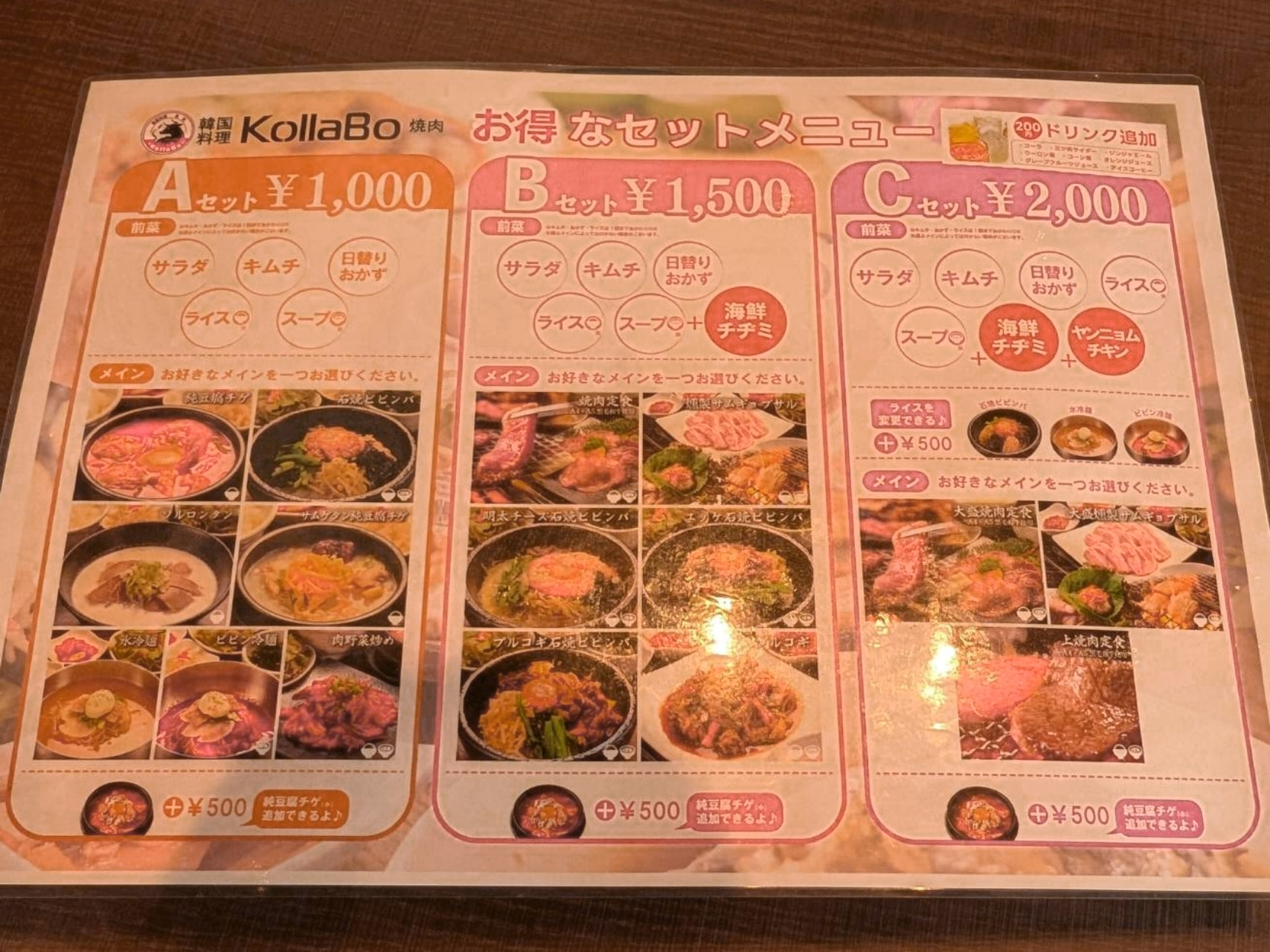 2,000円のセットには、さらにヤンニョムチキンが追加されます。メインも大盛りになったり、上焼肉定食なども選べるようになります。