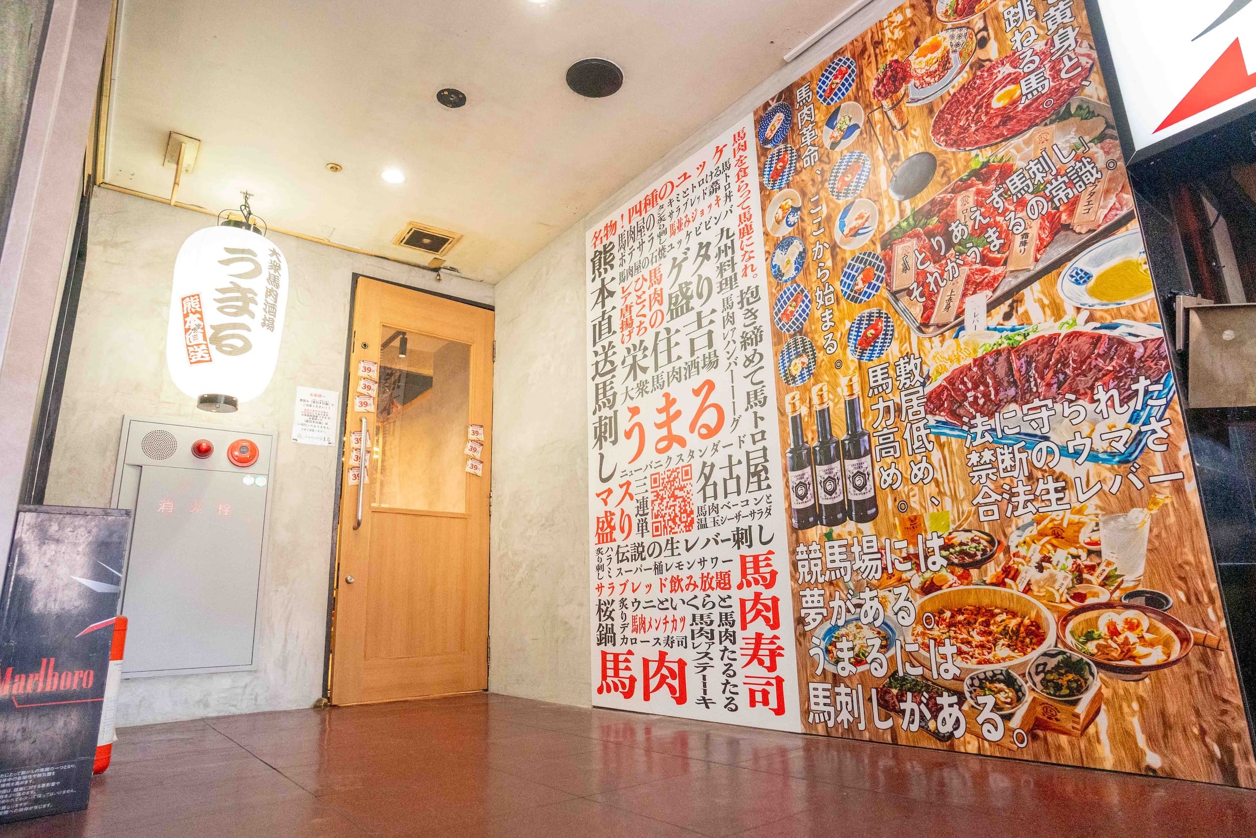 ビルの2階奥にあり、外観から“馬肉推し全開”なビジュアルがインパクト大!