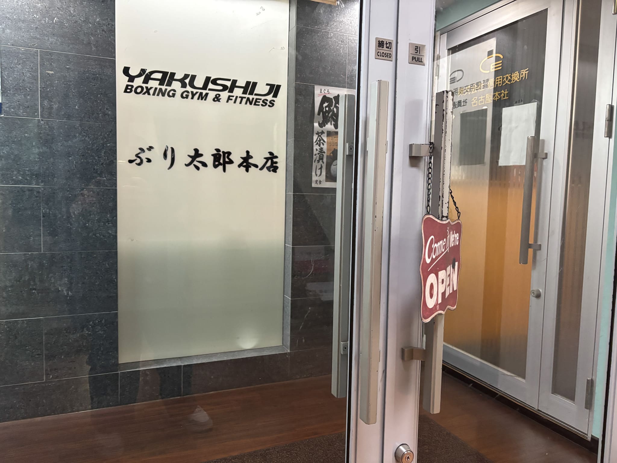 そして店の前に立つと、少し意外な光景が。入口付近にはチャンピオンベルトが飾られており、さらに隣にはボクシングジムも併設。和食店の入口としてはなかなか見かけない組み合わせ!