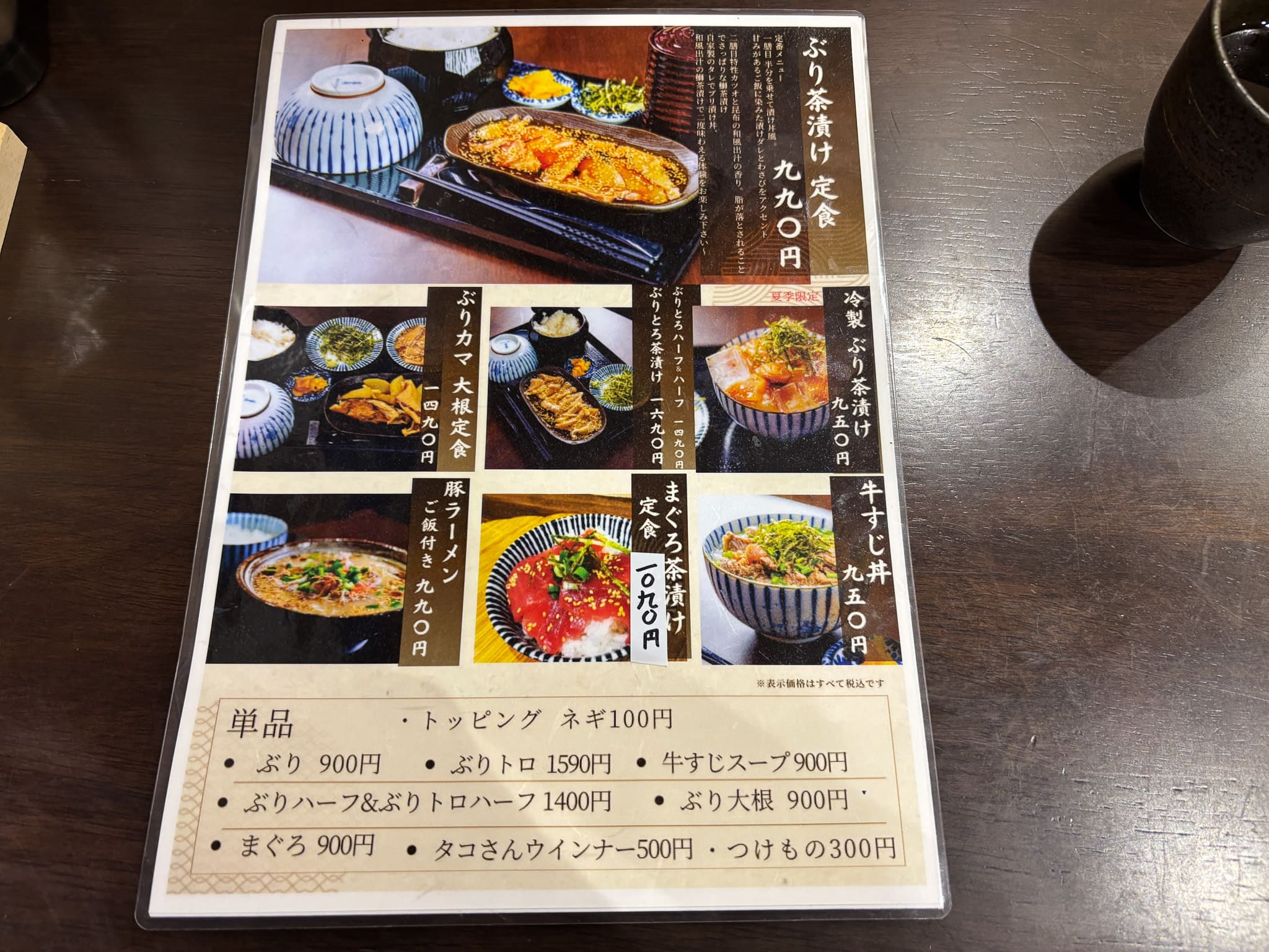 メニューはぶり茶漬けを中心に、定食や丼ものが並びます。