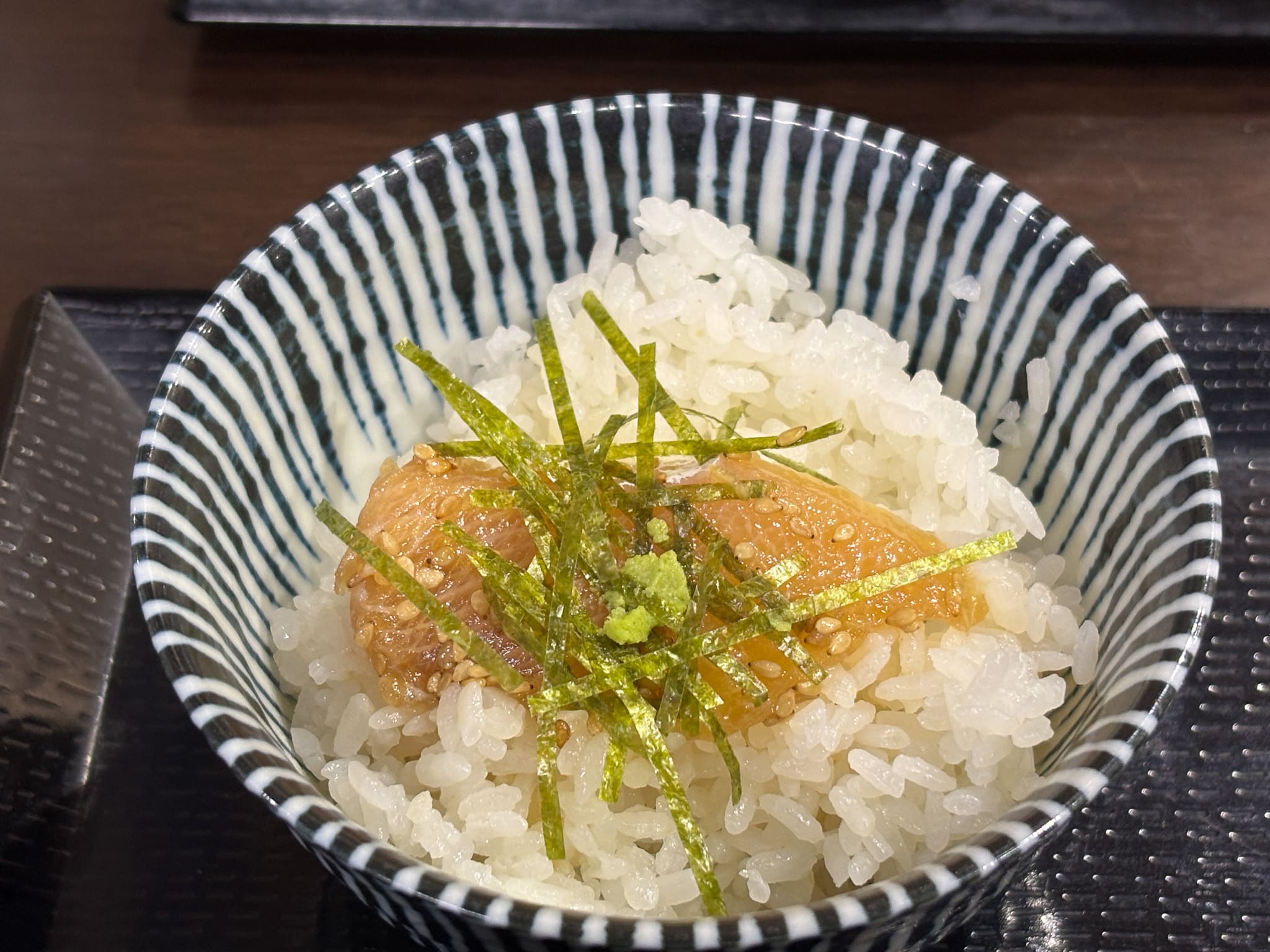 1膳目は白ごはんの上にそのまま乗せて、刻み海苔とわさびを少し添えていただきます。