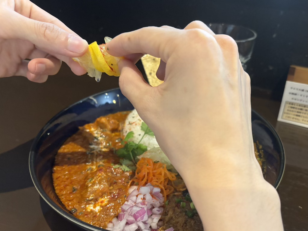 まずは左側のバターチキンカレーから。濃厚なバターの風味とほろっと崩れるチキンの食感が安定の美味しさ!