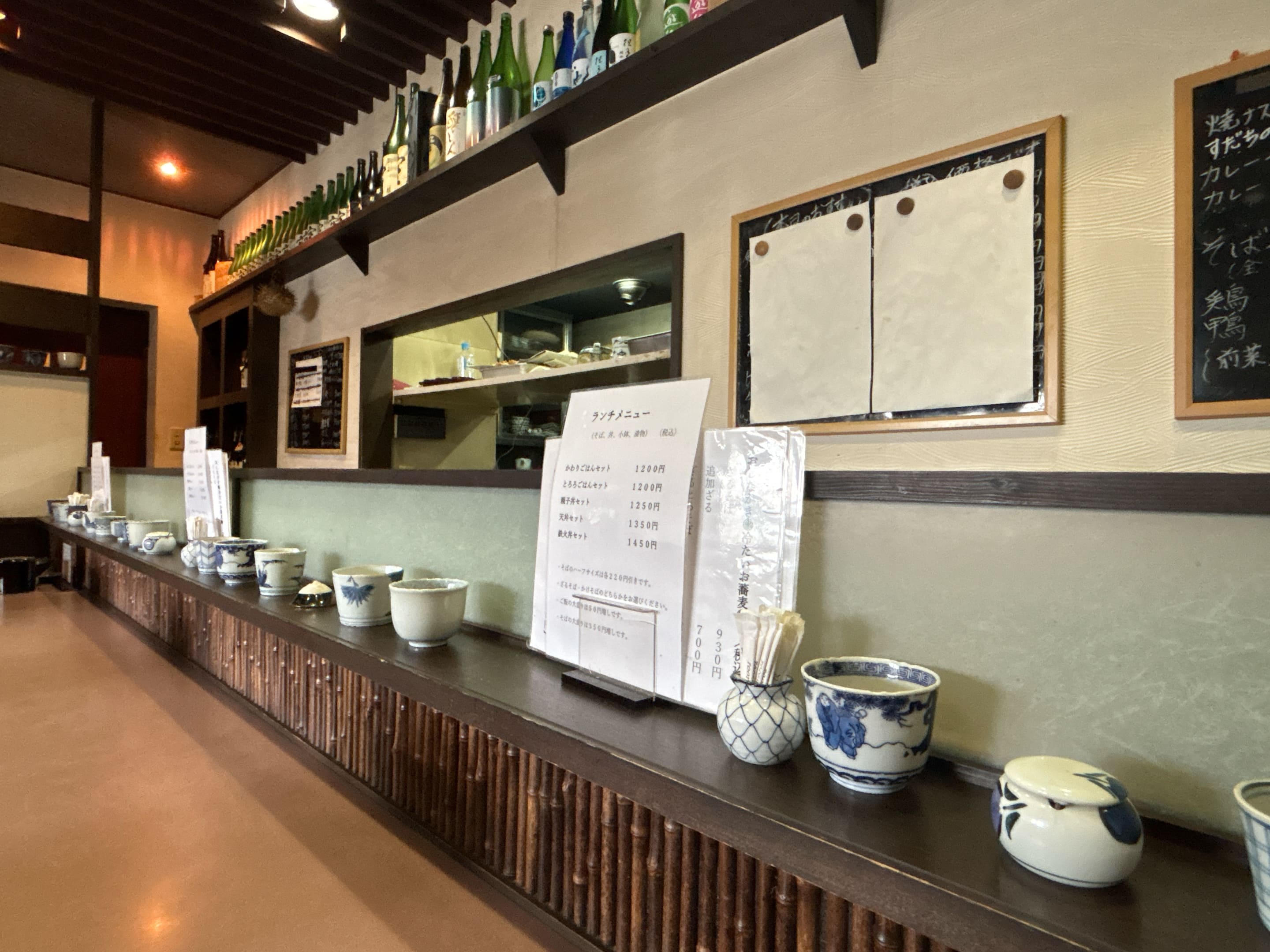 店内に入るとまず目に入るのは、カウンターにずらりと並んだ蕎麦猪口と酒瓶。ランチ以外にディナーも利用できます。