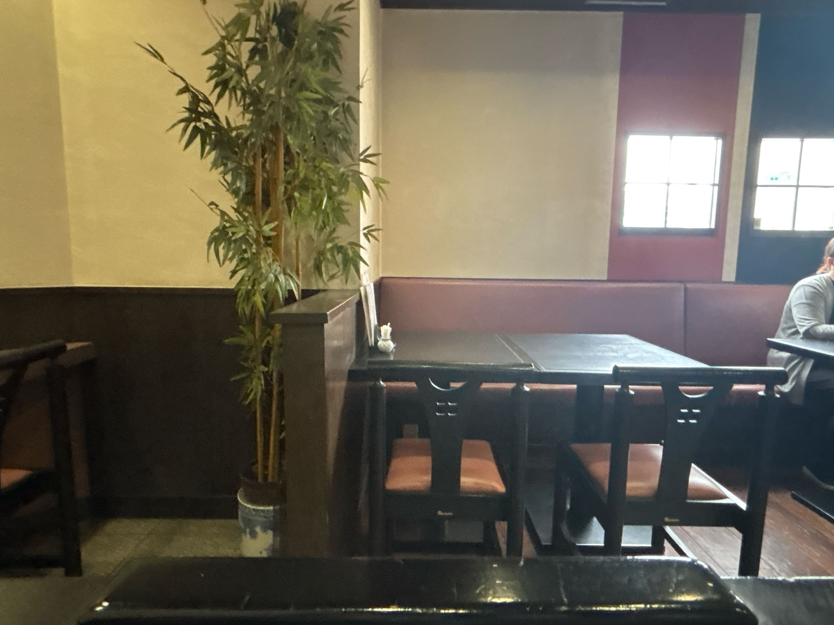 落ち着いた色合いのテーブル席。竹が飾られていて、ちょっとした和の風情を感じます。