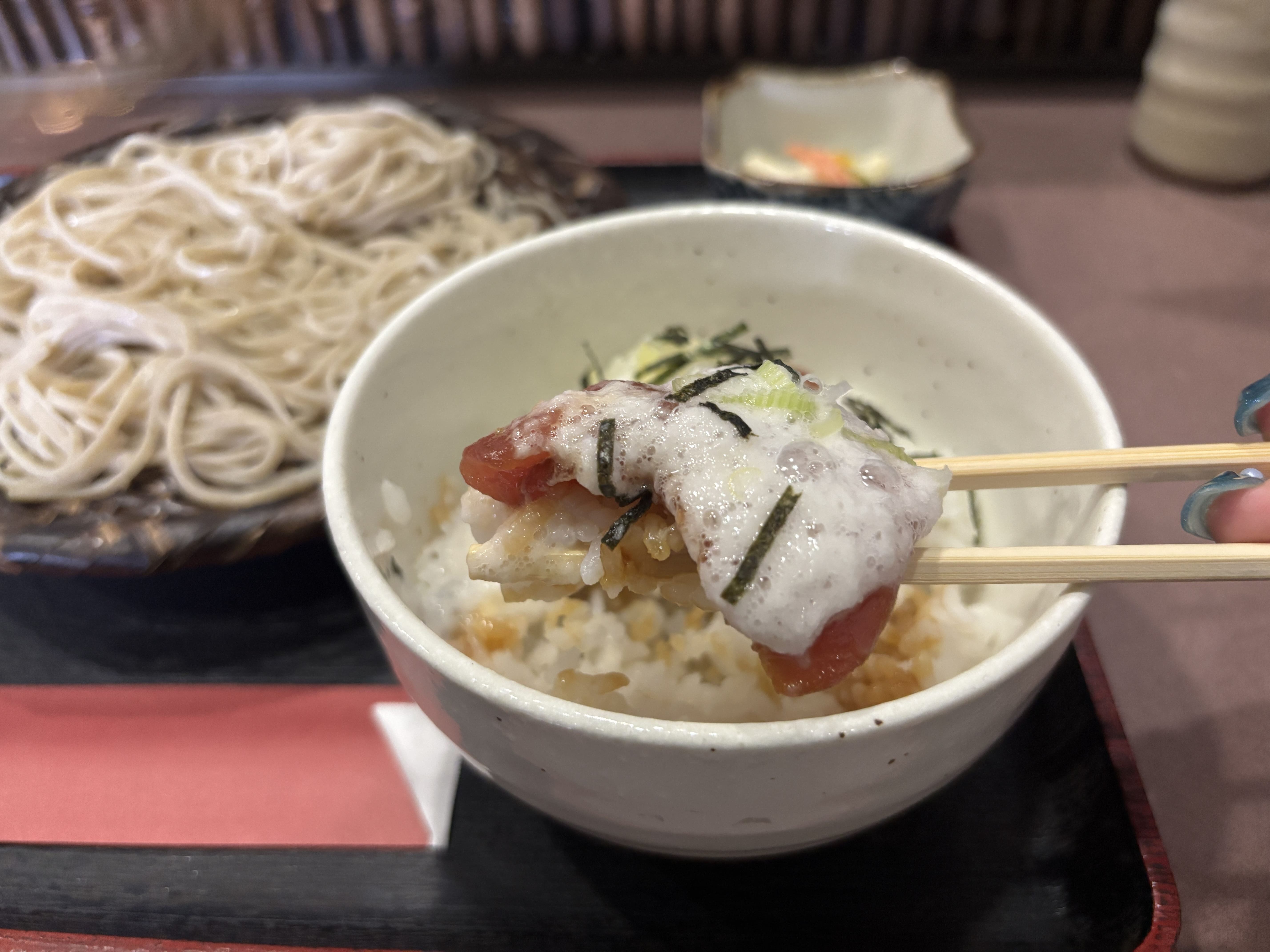 ざるそばに小鉢、漬物、そしてこの日のごはんものは「山かけ丼」。