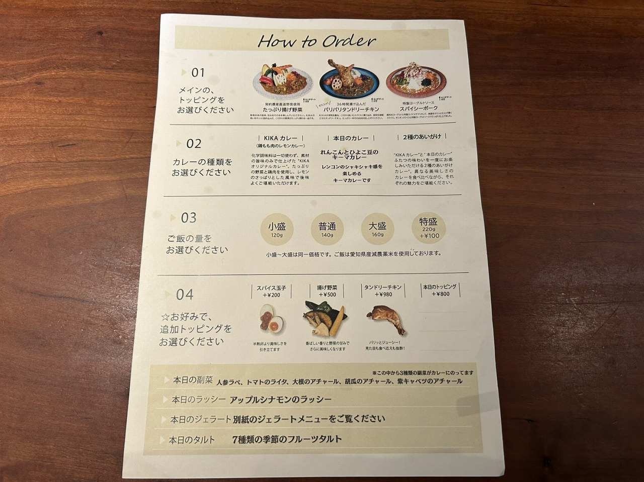 KIKAさんのランチタイムは11〜15時まで。ランチメニューはKIKAカレー、本日のカレー、2種のあいがけカレーの3種類から、トッピングは揚げ野菜、パリパリタンドリーチキン、スパイシーポークの3種類から選べます。