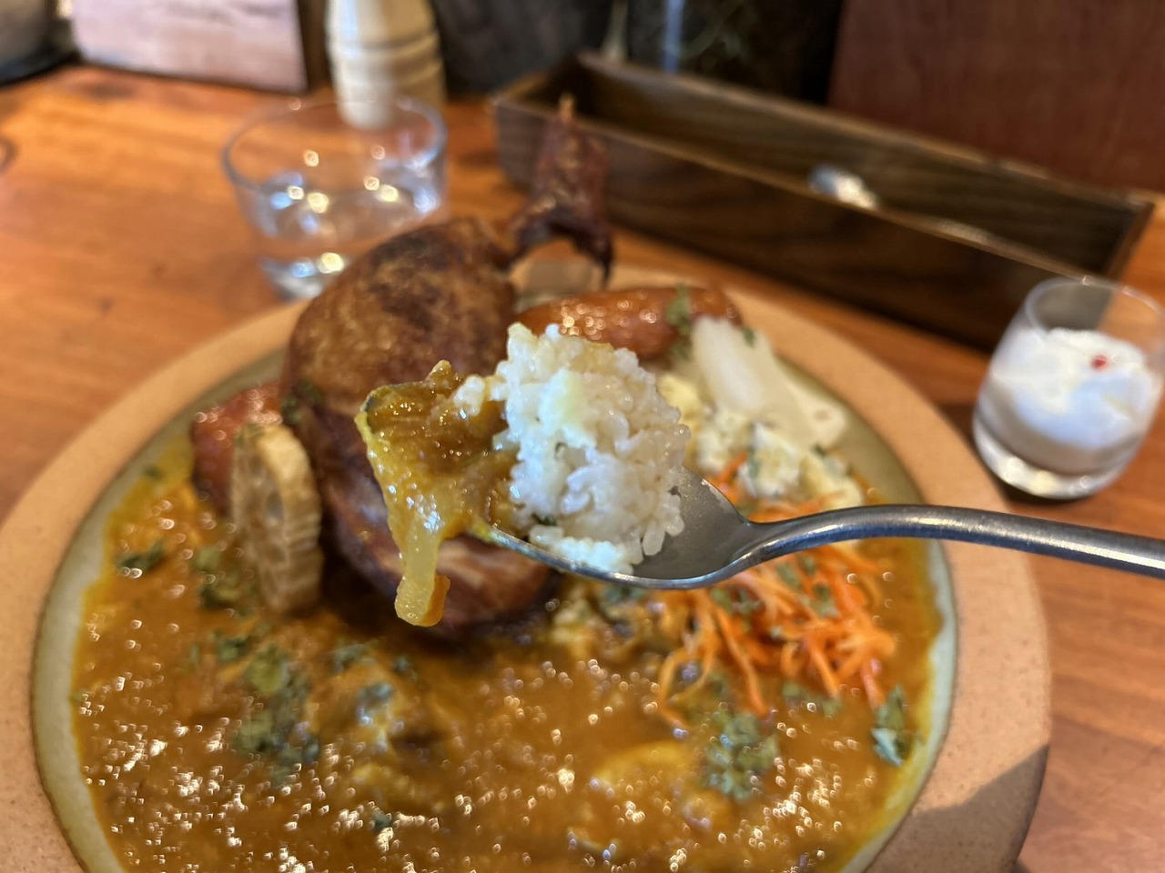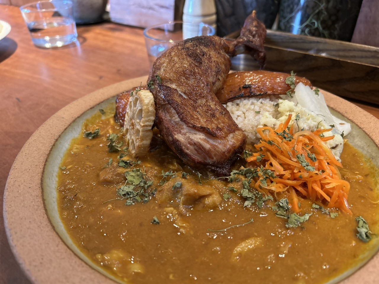 見た目のインパクトもさることながら、外側の皮がパリパリで中はしっとりとした食感のチキンは、スプーンで崩しながら食べられるほど柔らかく、とても美味しかったです。