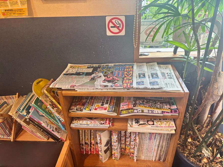 また、棚やカウンター側には、新聞・雑誌・絵本などが置かれているため待ち時間や食後に手に取って読めます。子連れのお客様でも落ち着いてゆったり過ごすことができる、地域に根ざした居心地のよい空間。