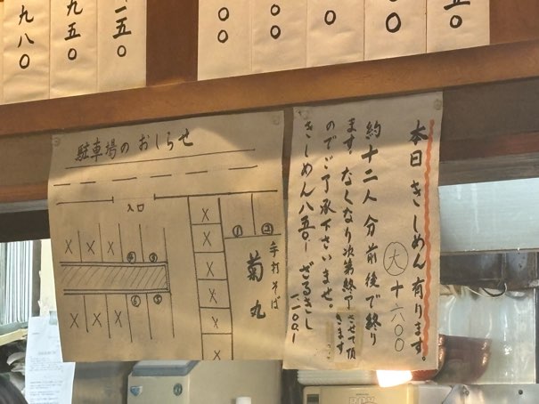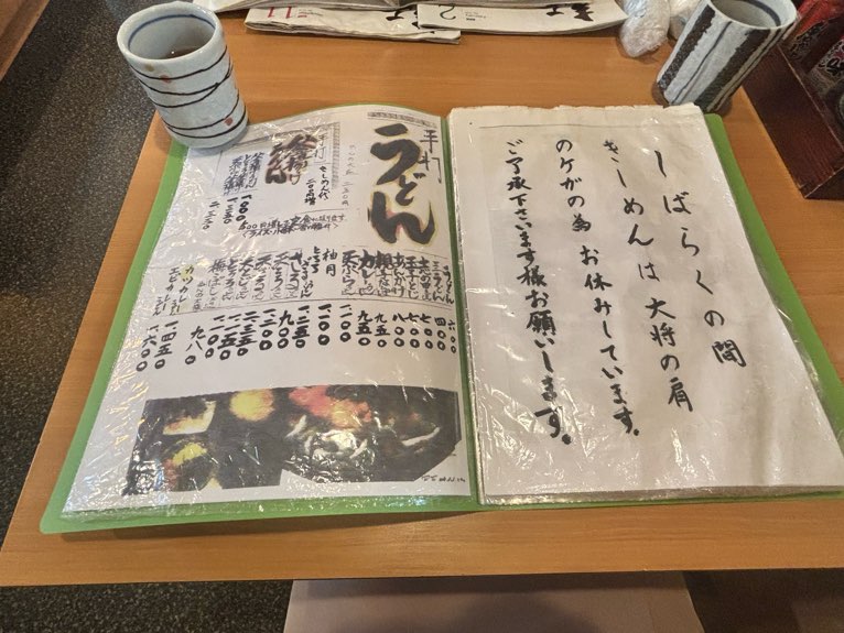 「きしめんはお休み中」とメニュー内に記載がありましたが、ふと厨房に目をやると「本日きしめん有ります!」との文字が。