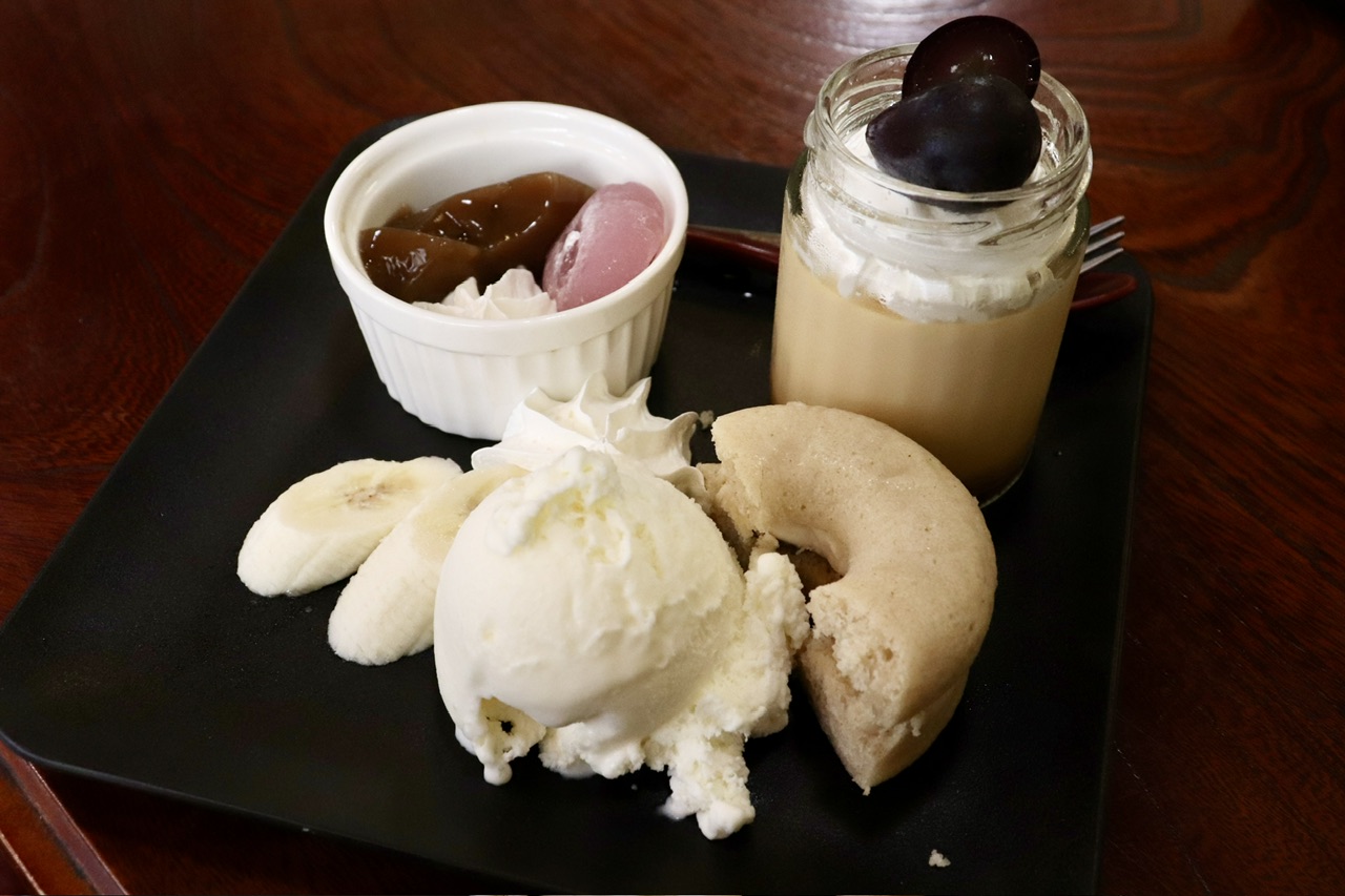 瓶の硬めプリンはブドウとホイップのせ。さらにアイスや果物、焼きドーナッツ、コーヒーゼリーや洋風のお団子など、いろいろなスイーツがちょこっとずつ楽しめます。これは400円でいいんでしょうか!