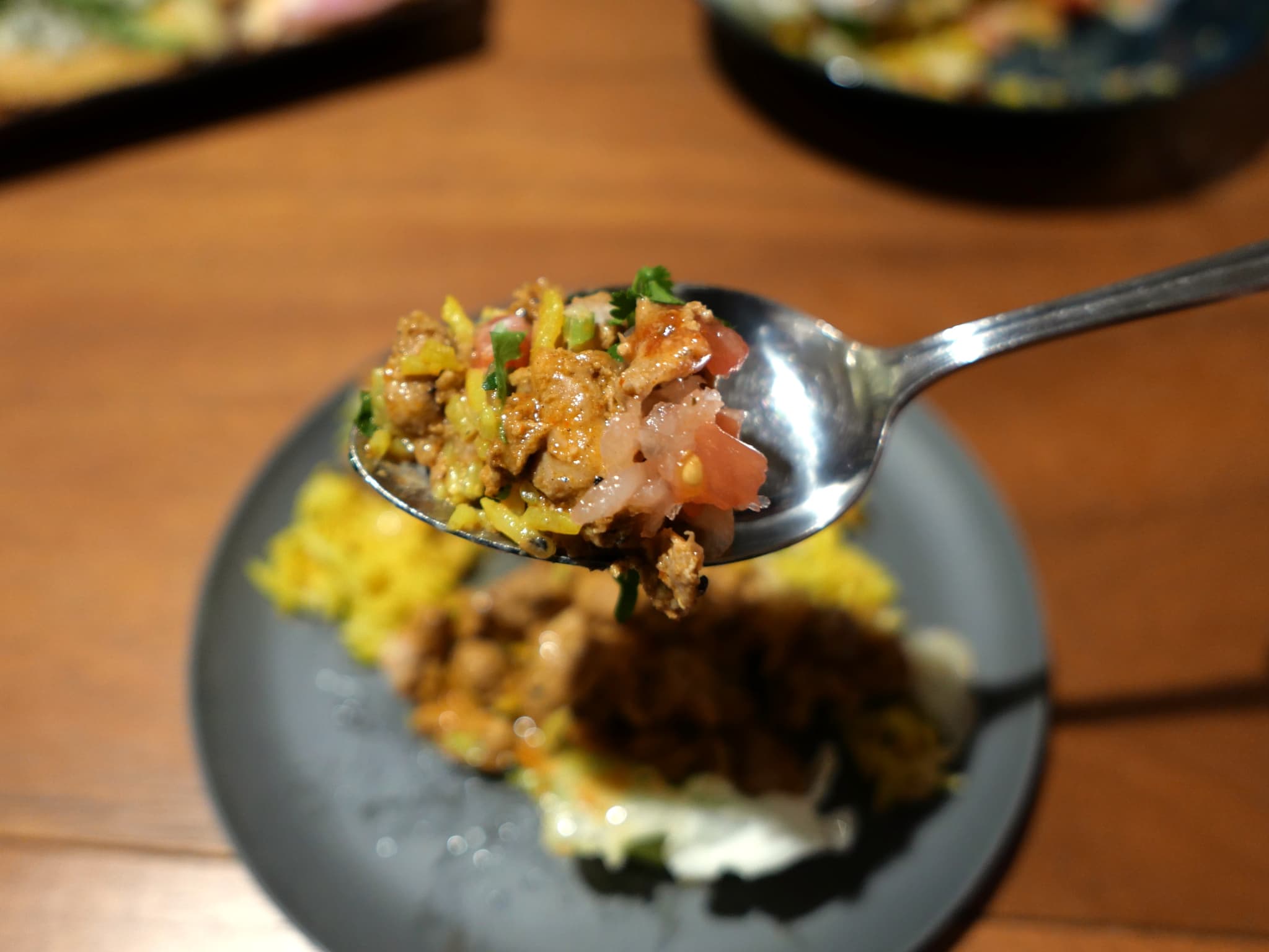 真っ赤なチリソースと爽やかなサルサ、スパイシーなお肉が合わさって、ご飯が進む味!ボリュームがあり、満足度の高いメニューです。