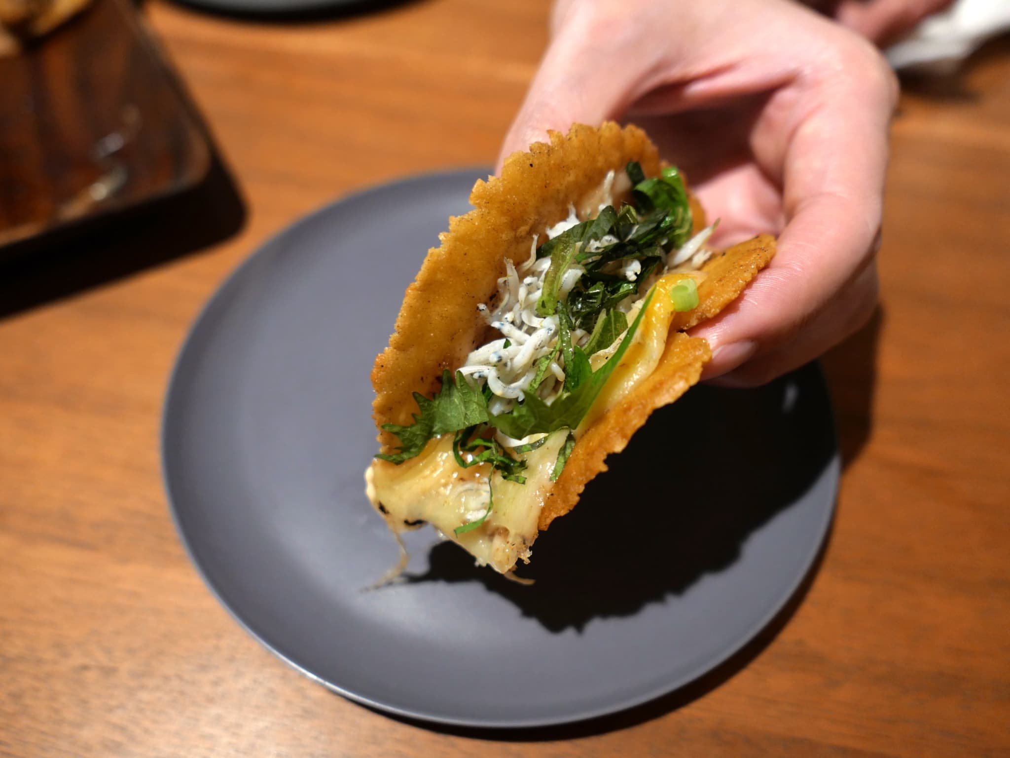 シラスは、とろとろのチーズや爽やかな大葉と一緒に食べる、新感覚のタコスです。