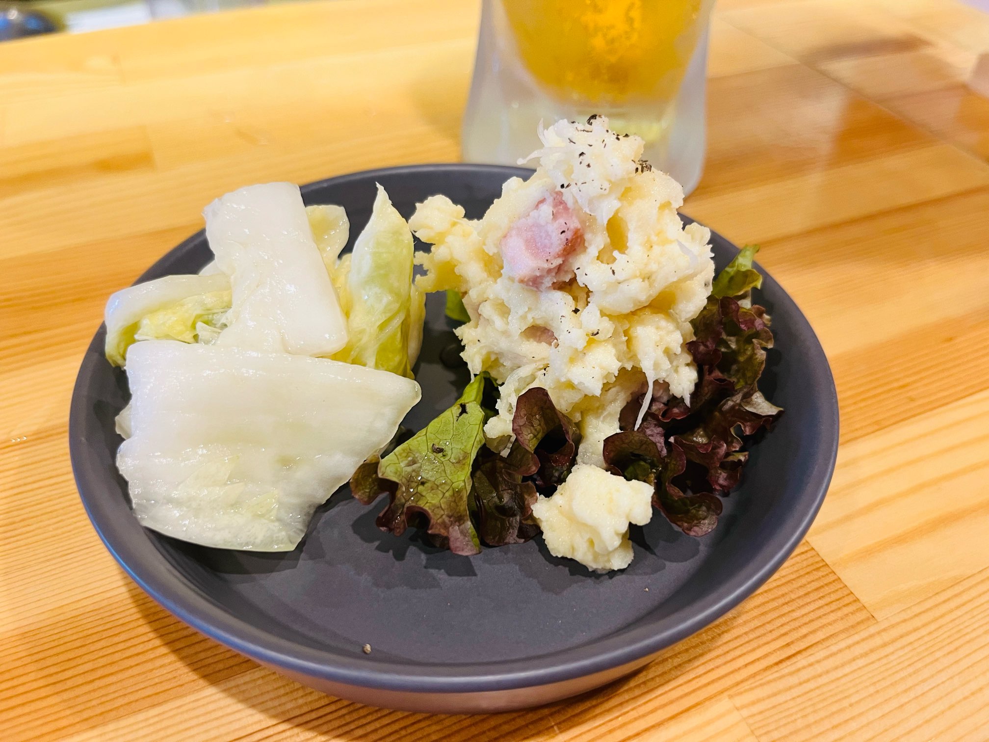 白菜の浅漬けは程よい漬かり具合で、シャキシャキ食感が残っており、お酒を迎え撃つ最初のアテとしてピッタリ。ポテサラはゴツゴツとした芋の食感が残った食べ応えもある一品。他の具材もしっかり入っており、ブラックペッパーのアクセントでビールが進みます。
