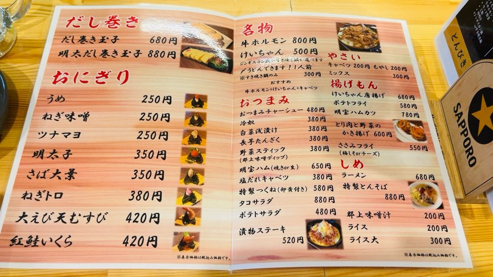 フードもドリンクと同様に酒場の定番メニューを抑えながらも岐阜、郡上の料理が目を引きますね。名物のホルモン、けいちゃん焼きに明宝ハムも岐阜が全国に誇る名物の1つですよね。