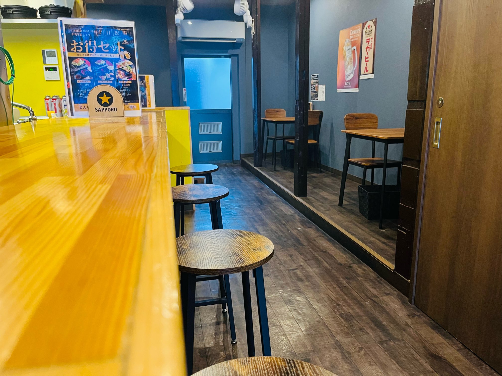 店内は木目調で統一されており、その温もりを感じる空間となっています。厨房の面したカウンター席、その反対側にはテーブル席があり、2階はお座敷となっています。