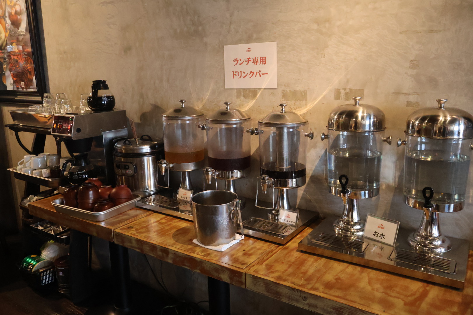 こちらは、ランチメニューに付いてくるドリンク、スープバーコーナーになります。