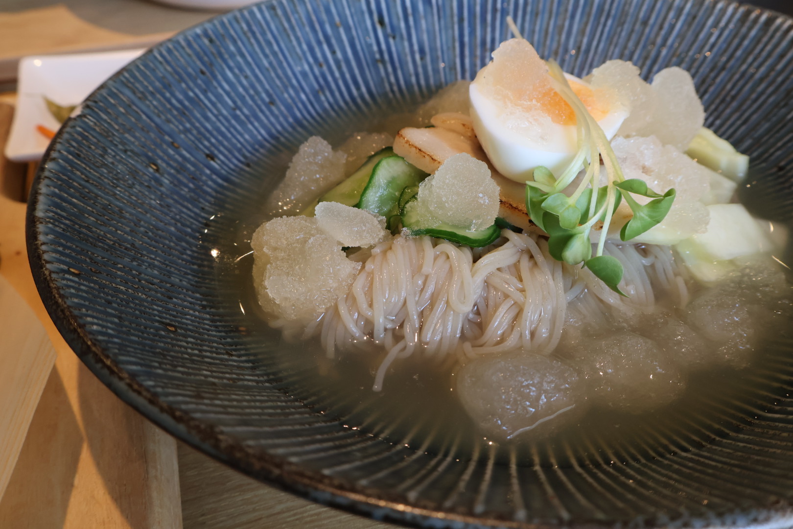 冷麺の具材には、きゅうり、チャーシュー、大根、かいわれ大根、ゆで卵が入っていました!