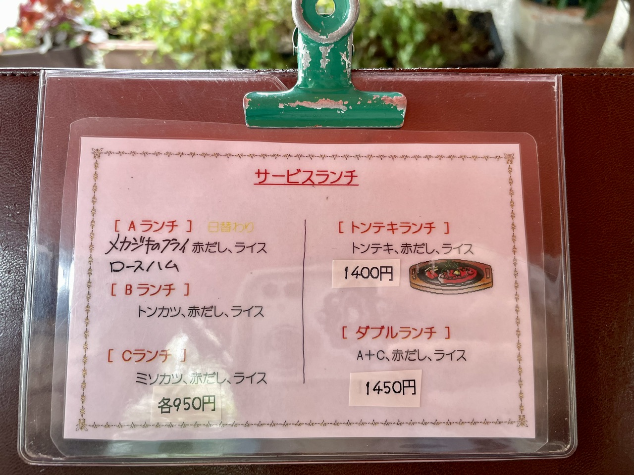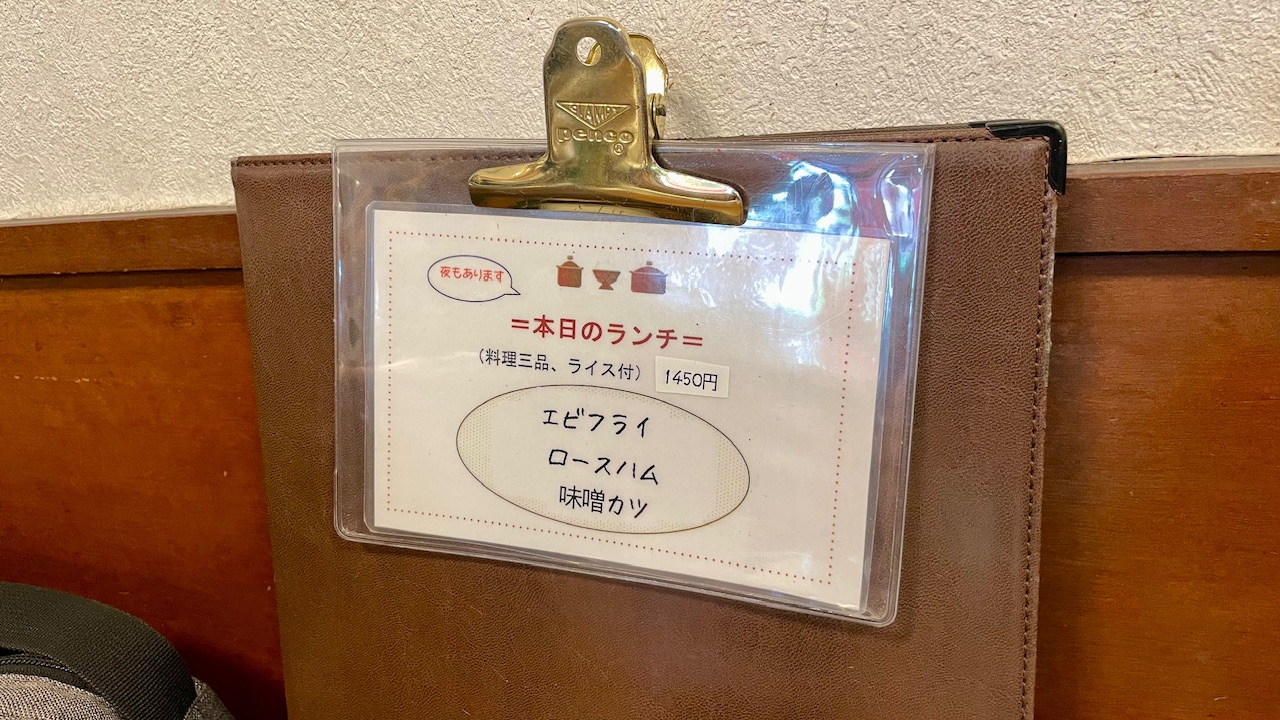 レトロな雰囲気のメニュー表。定番の洋食や定食、カレーライスなどが並びます。