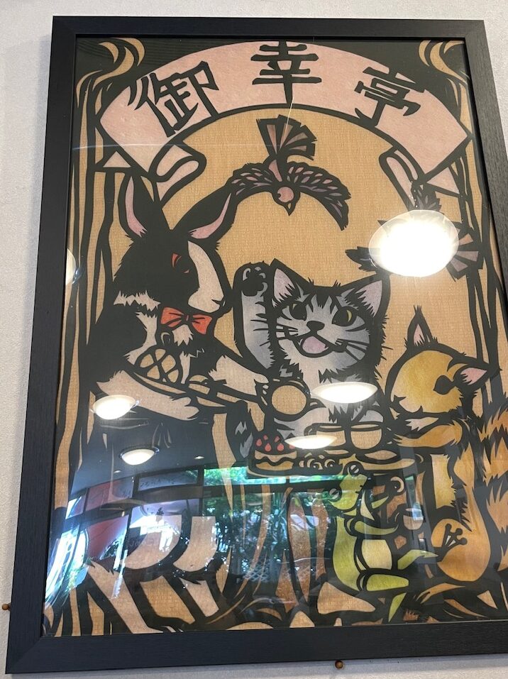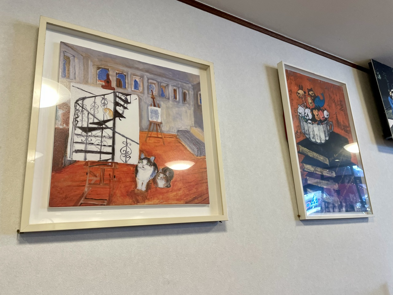 レストランを楽しむ動物たちの作品は、こちらのお店のシンボルとも言えそうです。絵本の1ページのような場面、どんな物語があるか気になりますね。