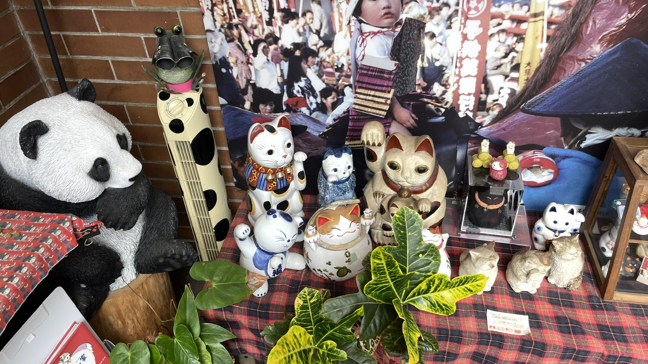 動物好き(猫好き?)なのか、所狭しと並ぶ動物の雑貨たち!招き猫がたくさんあって縁起が良いですね。かなり大きなパンダの置物も気になるポイント!