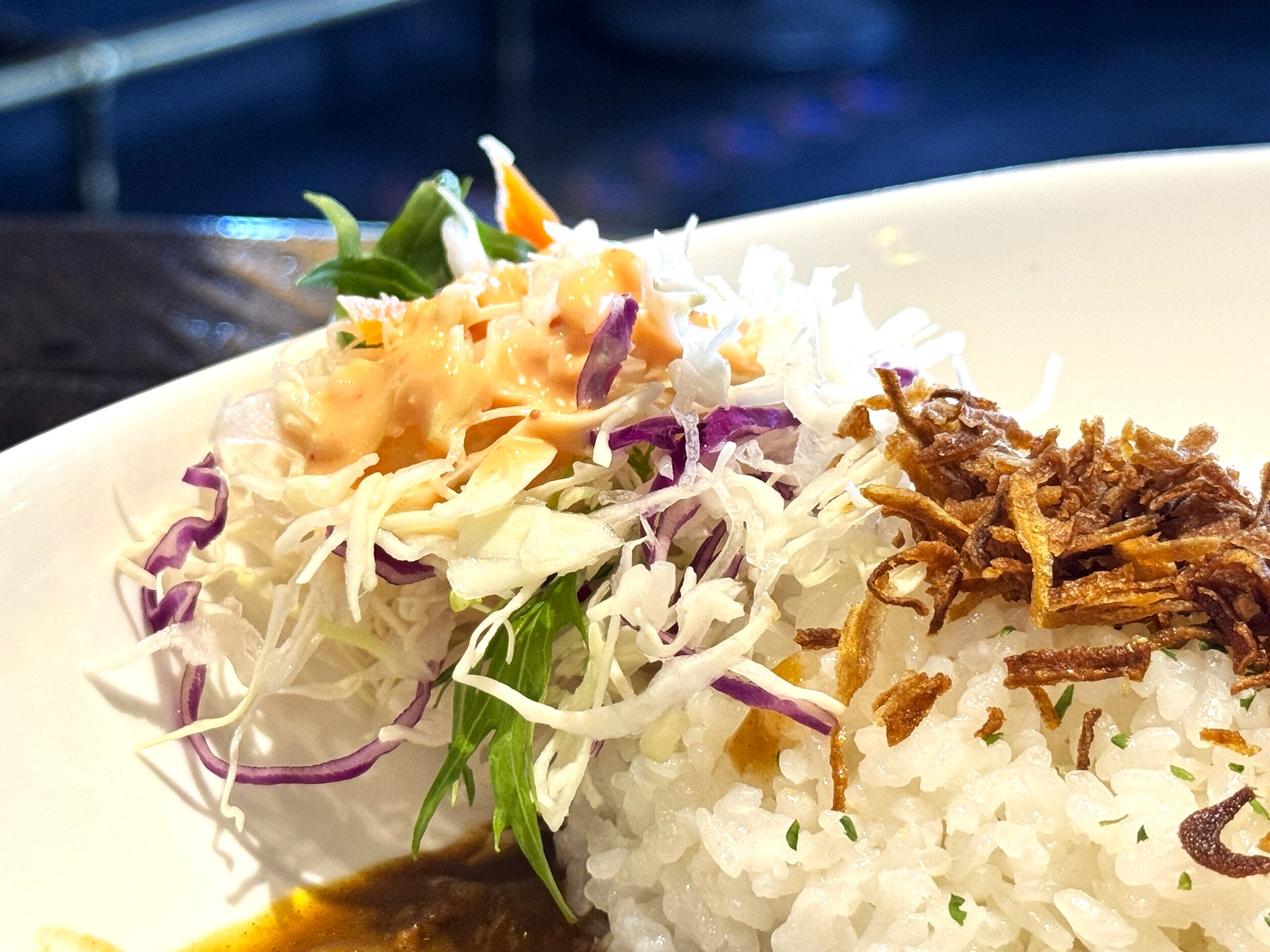 ご飯の両端には、ひかえめなボリュームのサラダとザワークラウト風の付けあわせが添えられていました。