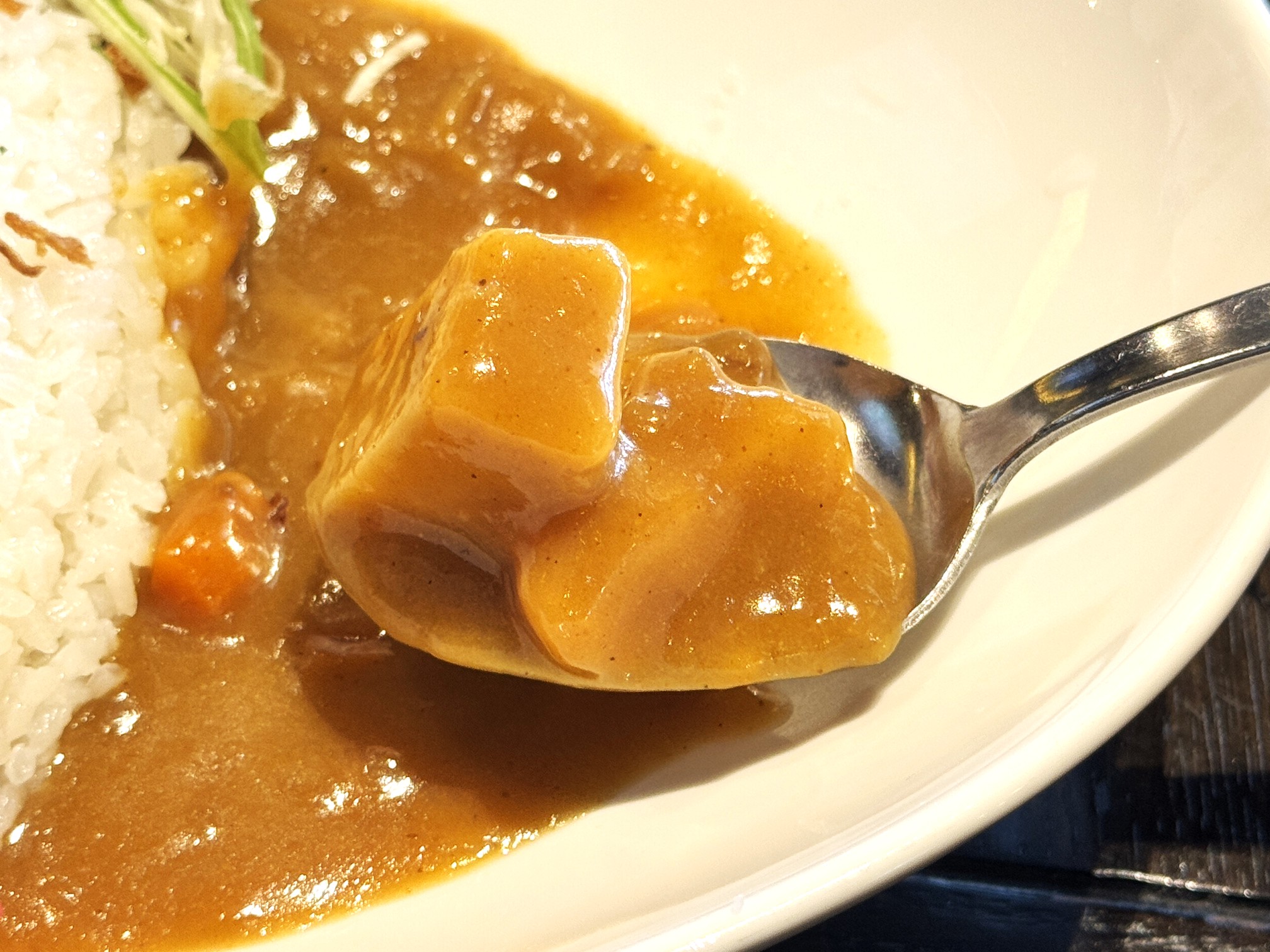あいがけカレーのもう1種は週替わりとなっており、この日は「ごろっと野菜カレー」が提供されていました。その名前の通り、ごろっと野菜カレーは、大き目にカットした野菜がたっぷりと入ったオーソドックスなカレー。