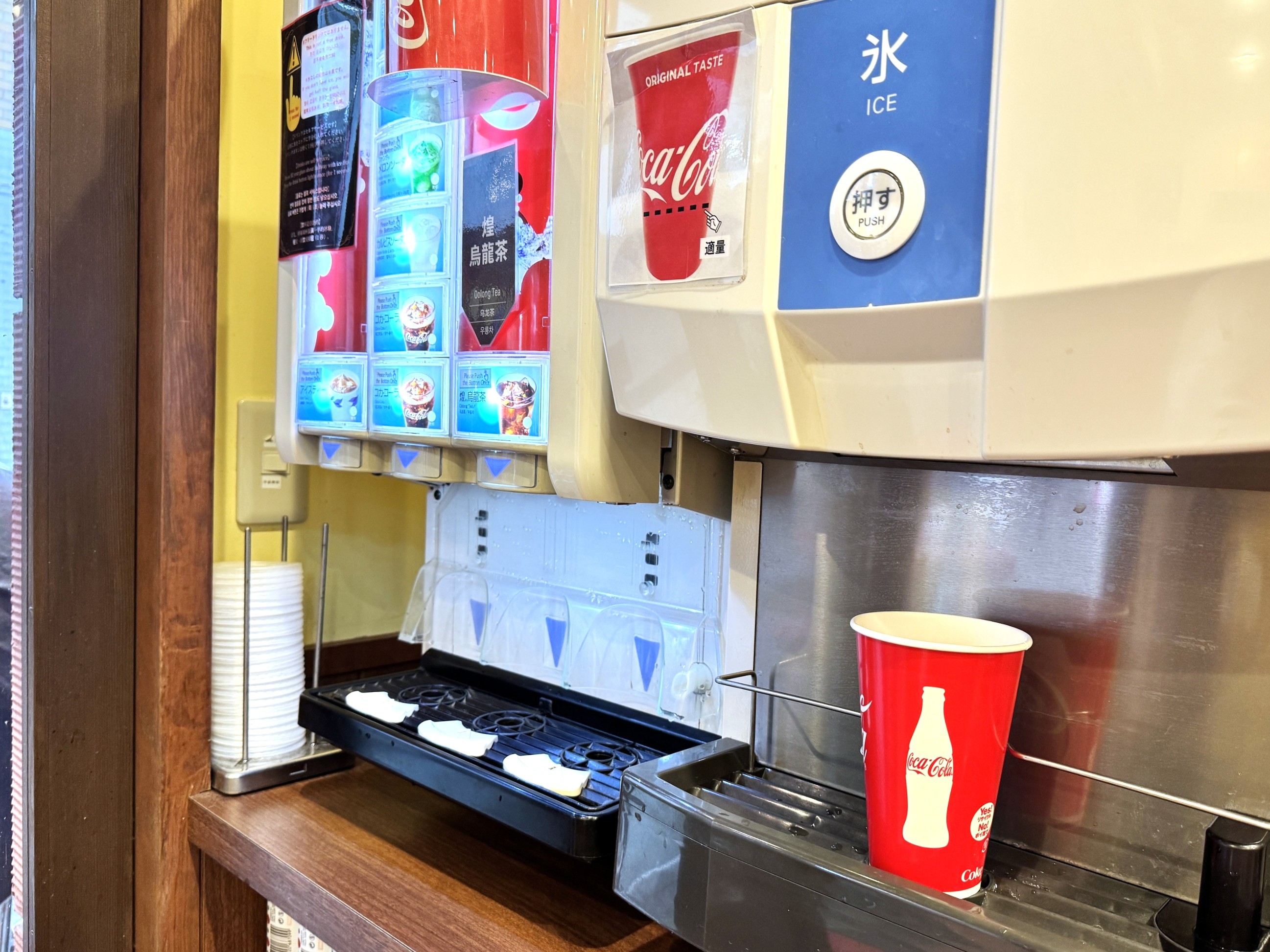 まずは券売機で食券を買い、オーダーを済ませます。セットの場合は食券と引き換えに紙コップをもらえるので、店内のドリンクサーバーからセルフサービスで選択したドリンクを注ぎましょう。