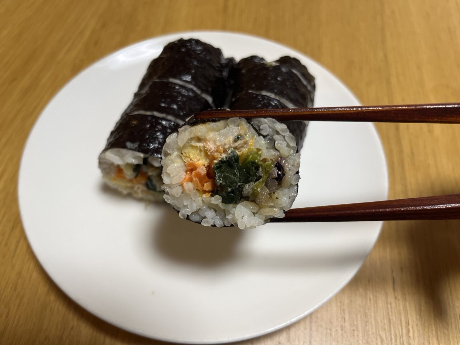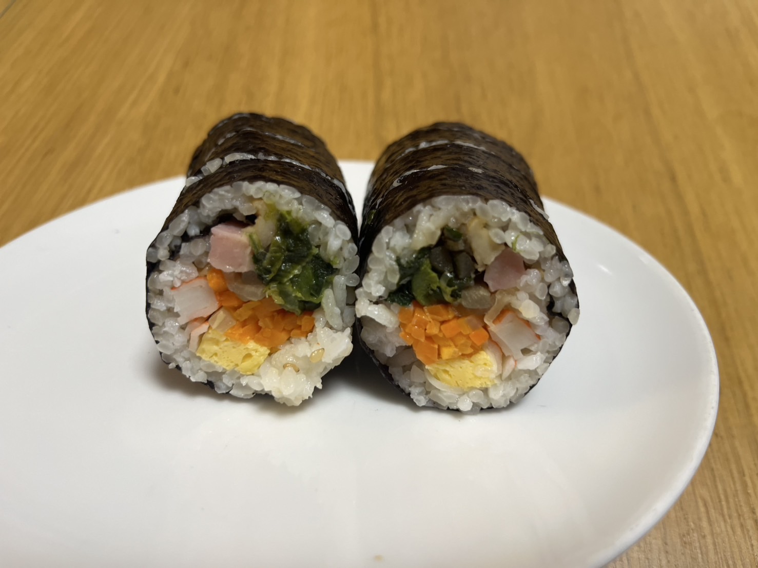 にんじん、ほうれんそう、ごぼうといった野菜に加え、玉子焼、カニカマ、ハムなどの具材がぎっしりと巻かれています。