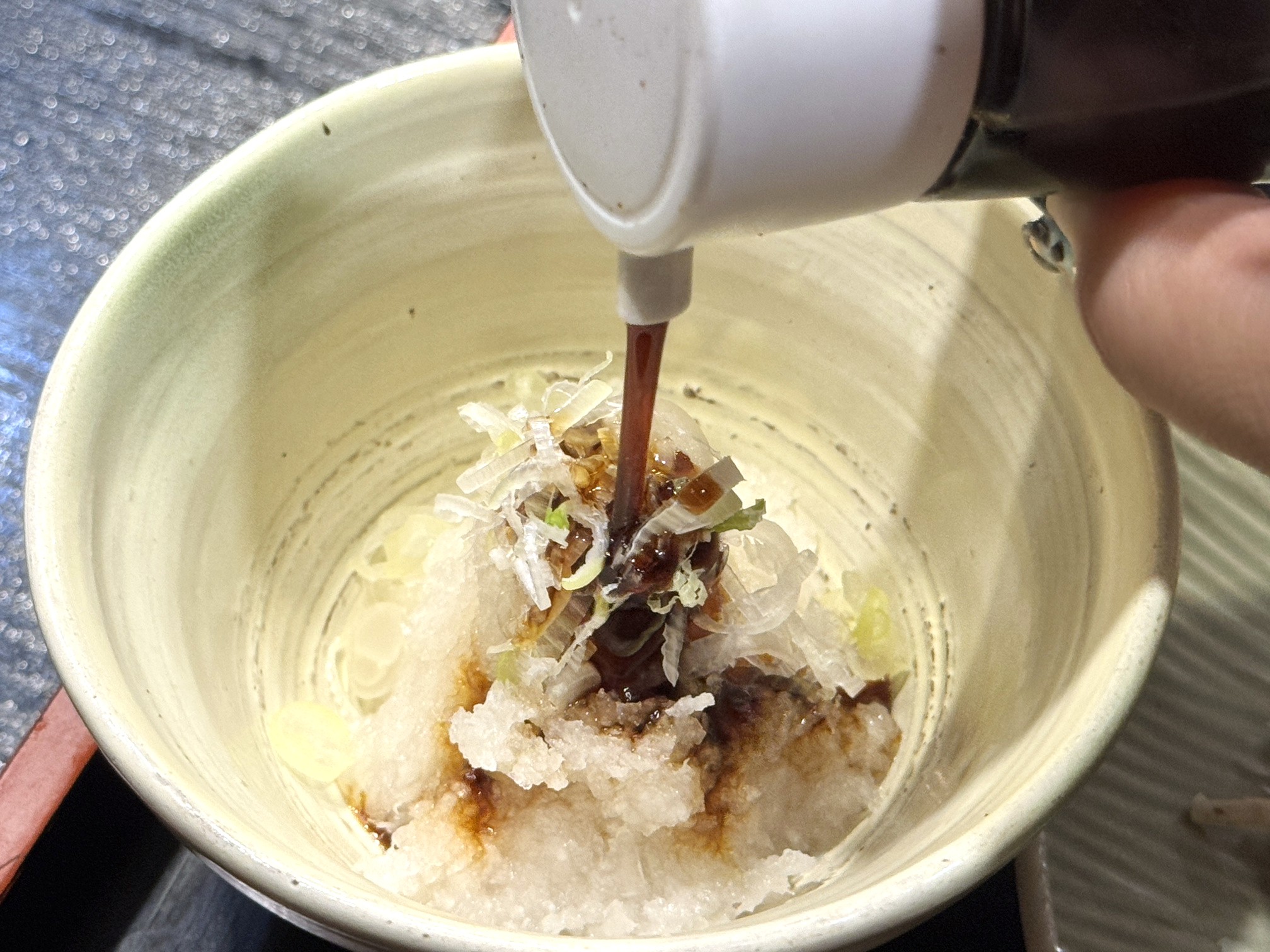 生醤油は、大根おろしが入った小鉢に好みの量を注ぎます。
